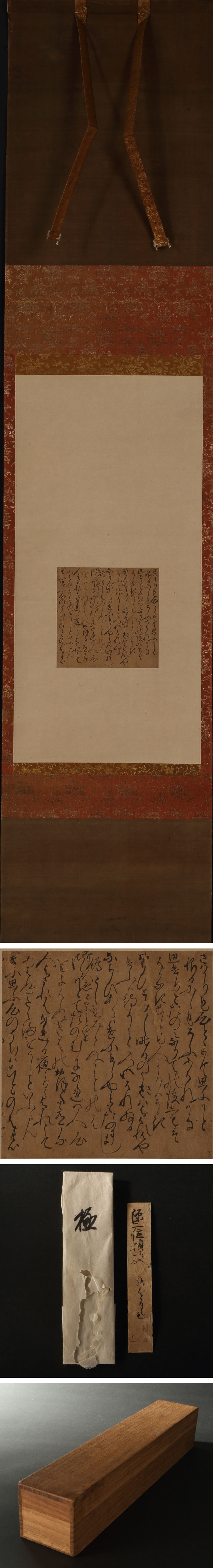 南北朝期の古筆切です。 『風雅和歌集(風雅集)』巻十二恋三より、京極為兼ら京極派歌壇の重鎮の歌6首が続く一面十四行の六半切です。古筆某による源頼政を伝称筆者とする極札が付属しますが、硬骨な書風から武将の書と推測した古筆見の時代錯誤であり、鎌倉期の似た書風の六半切は概して源頼政筆の鑑定を受けるきらいがあります。 しかしながら本作は他の伝源頼政の古筆と比べて、字粒の際立った極めて変化に富んだものであり、独特の骨法、風格が感ぜられます。何よりも特異な点が詞書・作者の大半を欠く点であり、二行に分かち書きする書風からも室町期を下るものと考え難く、『風雅集』編纂時に極めて近い書写と推察されます。 用字についても、「人」「心」「思ふ」に常に漢字を用いるなど一定の思い入れ、こだわりがあるとみられ、想像を逞しくするならば、「心のままに詞のにほひゆく」歌を志した京極為兼の謦咳に「じかに」接した人物が「真の筆者」ではないでしょうか。また、その人は、もはや「詞書」や「作者」を書く必要がないほど、和歌が詠まれた「その瞬間」を知る歌壇の主要人物である可能性が高く、歌順の差異や異文の少なさからも、歌集の編纂に深くコミットした人物――風雅集選集の監修をおこなった花園院に何らかの関係があるのではと信じたくもなりますが、花園院の宸翰和歌史料は絶無であり、ツレの出現が心より俟たれます。 風雅集は鎌倉幕府の滅亡や南北朝の分裂、京極派を主導した伏見院・永福門院の崩御により撰集が難航し、その完成は花園院・光厳院の目の前で六波羅探題の武士が集団で自害し、南朝により光厳天皇の即位自体が否定されるなど凄惨な事件を経ての悲願でありましたが、二条派の歌道からは異端とみなされ、その評価は近現代まで不当に貶められてきました。 玉葉集が玉と葉という壊れやすく儚い題名を批判されたのと同様に、風雅集は花園院により当初「正風和歌集」の名が与えられましたが、「傷風」と音が通じることを忌避された事情を有します。在りし日の京極派歌壇の栄華と、心ない人々に幾度となく傷つけられながらも再起を果たした持明院統の天皇たちの奮闘がしみじみと感ぜられる逸品です。 〔本文〕 さはかりも心とゝめて思ふかと(花園院冷泉) 恨るにしもそふあはれかな 思けりとたのみなりての後しもそ(京極為兼) はかなきことも人よりはうき おもひとりし昨日のうさはよはれはや(京極為兼) けふは待そと又いはれぬる ならひあらはけにもしやともたのままし(永福門院) 偽としもみえぬことのは 寄人恋といふことを (花園院) さらはとてたのむになれは人心 をよはぬきはのおほくも有かな 人よされはたれか夜かるゝよかれとて(徽安門院一条) あはぬたえまをうしといふらん けに思ふ心のうちはことのはの(入道二品親王法守) 付属:時代箱、古筆某の極札(伝称筆者源頼政)が付属します。 寸法:高さ128cm、幅28cm(最大幅。若干の誤差はご了承下さい) 状態:本紙虫食い、イタミがございます。 |