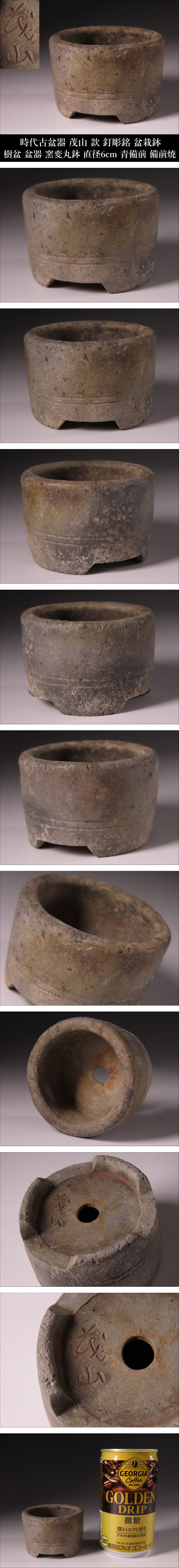 【ONE'S】時代古盆器 茂山 款 釘彫銘 盆栽鉢 樹盆 盆器 窯変丸鉢 直径6cm 青備前 備前焼 古美術品 | |||
