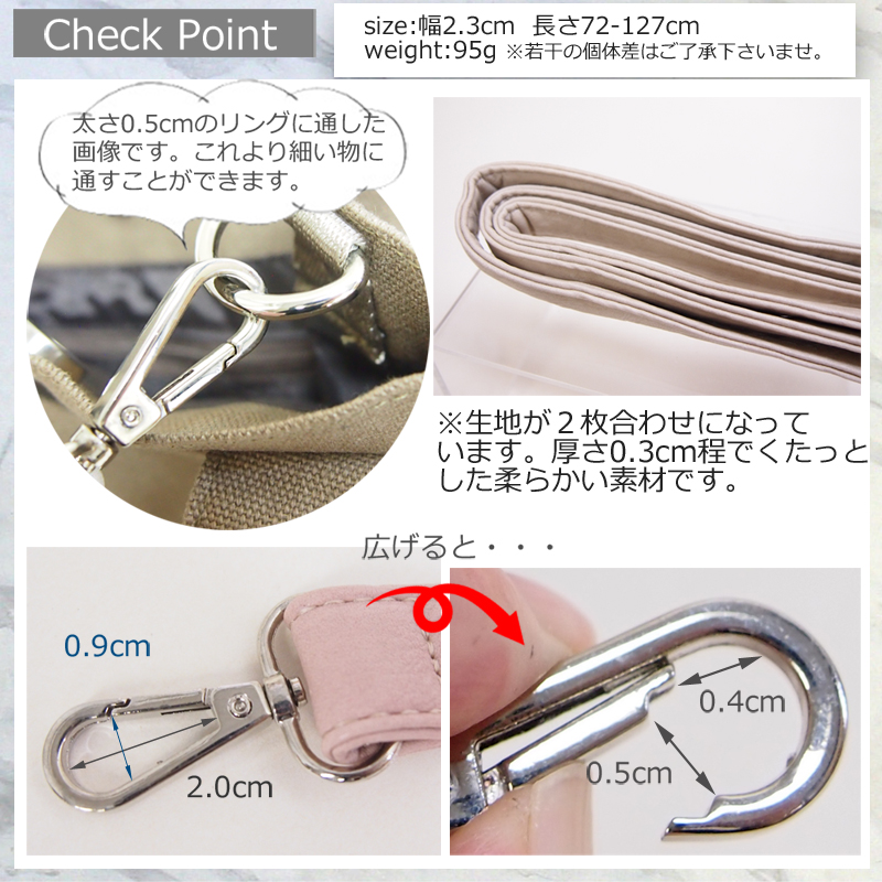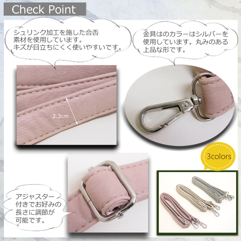 | comments | 【こちらはアウトレット品です。薄く変色している箇所が所々あります。あまり目立ちませんが、アウトレット品として販売させて頂きます。ご了承の上ご購入下さいませ。】こちらは合成皮革素材を使用したショルダーストラップです。シュリンク加工を施した柔らかい素材です。生地は2枚合わせになっておりしっかりとしています。金具はシルバーで、丸みのあるナスカンを使用しています。アジャスター付きでお好みの長さに調節が可能です。 | |
