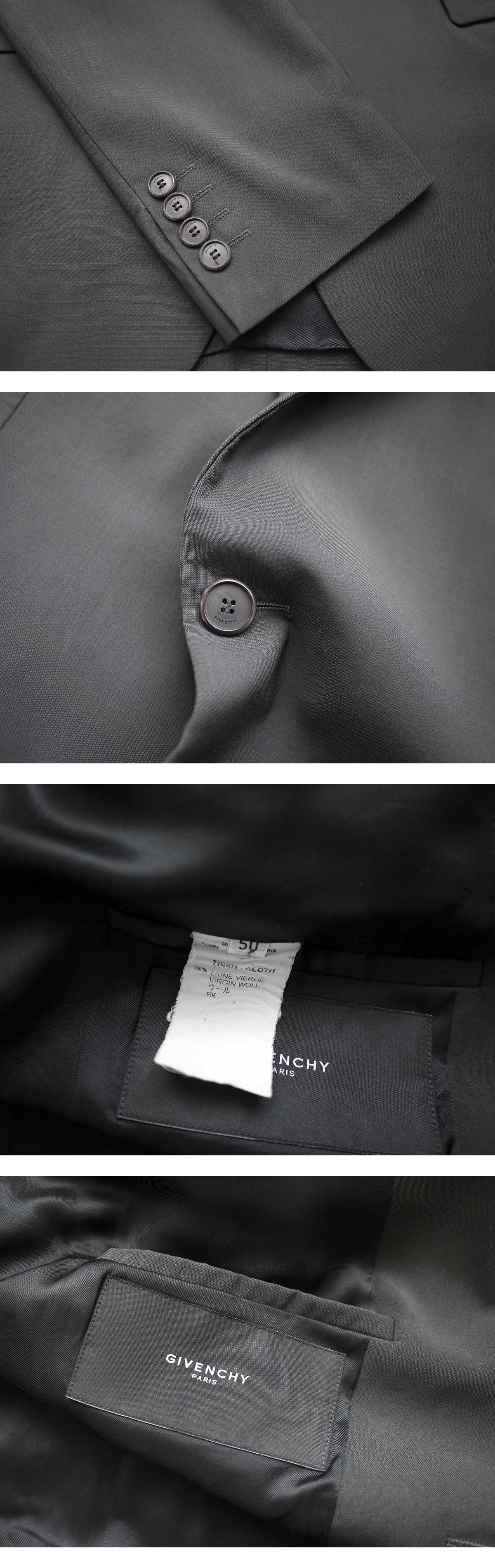 ジバンシーのウールギャバジンセットアップスーツでございます。正規店購入の100%正規品となります。背面にはジバンシーの特徴であるダーツ入りです。極限までムダをそぎ落としたミニマルなシルエットで、ジバンシーならではのモードテイストが随所に体現されたセットアップです。