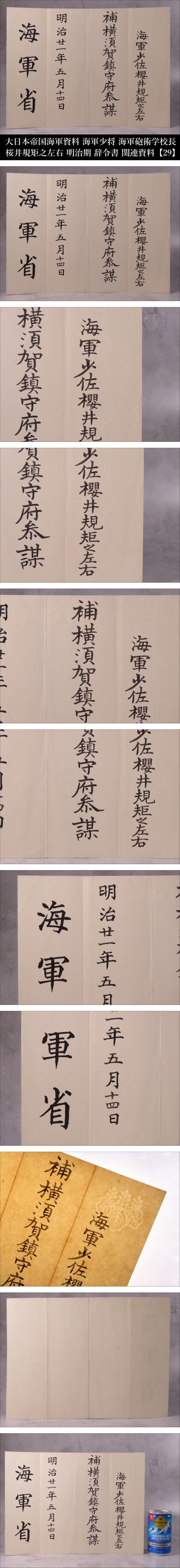 | Lot.20260423HA251129OSX/10 ※ご入札いただいた時点で下記記載事項全てにご了承いただいたものとさせていただきます。 ※商品タイトルは当方判断に基づき記載しております。また単にキーワードとして記載している場合もございますので予めご了承ください。 【ONE'S】大日本帝国海軍資料 海軍少佐 海軍砲術学校長 桜井規矩之左右 明治期 辞令書 関連資料 海軍省 明治二一年五月十四日 【29】 桜井 規矩之左右(さくらゐ きくのすけ) 嘉永元年6月6日(1848年7月6日) - 大正元年(1912年11月27日)64歳没 日本の武士、大日本帝国海軍の軍人。海軍兵学校3期。最終階級は海軍少将。 海軍砲術学校長、巡洋艦「比叡」「松島」「千歳」「橋立」の艦長を歴任。 日清戦争において比叡艦長として特に黄海海戦で功績を残しました。 彼の貢献は日本の海軍史において重要な位置を占めています。 《幕末の佐倉藩に生まれ、海軍の礎を築いた「海の侍」。日清戦争・黄海海戦にて、絶望を希望に変えた奇跡の突撃。敵の巨大戦艦に包囲され、沈没か降伏かの絶体絶命の淵に立たされた軍艦「比叡」。その極限状態の中、桜井は「敵陣中央突破」という戦術の常識を超えた決断を下した。炎の中を突き抜けたその一閃は劣勢だった日本海軍を奮い立たせ、日本の運命を変えた伝説の男。》 なかなかお目にかかることのないお品物をこの一期一会のご機会にぜひ。 【商品状態】 掲載画像をご覧下さい。 あくまでも年代物かつ一度人の手に渡っているお品物のため、汚れ、変色、経年による劣化等があるものとお考えいただき、神経質な方のご入札はお控えください。 PC上の画像と商品の色目が若干異なる場合がございます。 説明文に記載のある品物や写真に写っているもの以外は基本的に付属致しておりません。 落札後のトラブルを避ける為にも、説明文および画像をよくご覧になってから、ご入札のほどよろしくお願い致します。 商品状態の記載に関してはあくまでも当方判断基準となっております。 状態等の詳細は写真をご確認いただき購入者各自のご判断にてご入札ください。 | |||