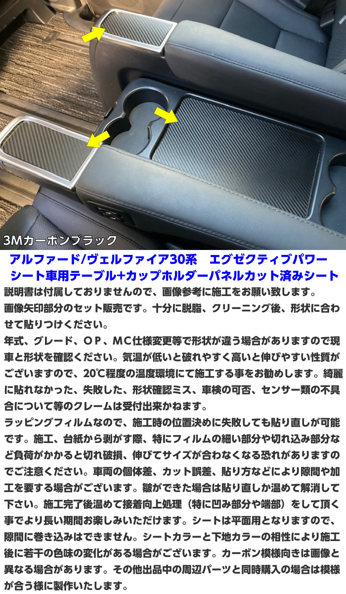 ※カーボンホワイト、ギャラクシーブラックは廃盤の為お選び頂く事ができなくなりました。 3M製以外は別ページで販売中です。 ※ご連絡なくお支払が終わっている場合はカーボンブラックにて発送させていただきます。 ③車両専用ラッピングシート ラッピングシートは剥がす際に糊残りがしにくく、貼り付けに失敗した場合でも 貼り直しが可能です。 当店では、雨、紫外線、風埃、熱等の環境が過酷な自動車には車両専用のシートをご使用される事を推奨しております。 ◆商品詳細◆ ★商品名:アルファード/ヴェルファイア30系