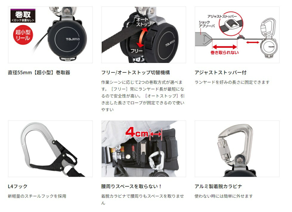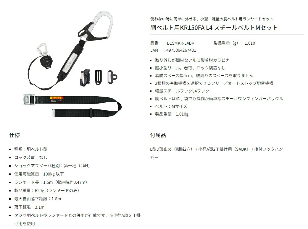 タジマ TAJIMA着脱式胴ベルト用ランヤード胴ベルト用ランヤード KR150FA L4 スチールベルト MセットB1SMKR-L4BK■機能・取り外しが簡単なアルミ製着脱カラビナ・超小型リール・巻取、ロック装置なし・着脱スペース幅4cm・腰周りのスペースを取りません・2種類の巻取機構を選択できるフリー/オートストップ切替機構・軽量スチールフックL4フック・胴ベルトは革手袋でも操作が簡単なスチールワンフィンガーバックル・ベルト:Mサイズ・製品重量:1,010g■仕様・種類:胴ベルト型・ロック装置:なし・ショックアブソーバ種別:第一種(4kN)・使用可能質量:100kg以下・ランヤード長:1.5m(収納時約0.47m)・製品質量:620g(ランヤード)・最大自由落下距離:1.8m・落下距離:3.1m・タジマ胴ベルト型ランヤードとの併用が可能です※小径A環2丁掛け用を使用■材質・L型D環止め(樹脂2穴)・小径A環2丁掛け用(SABK)・後付フックハンガー