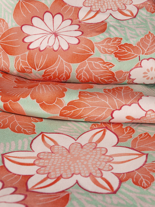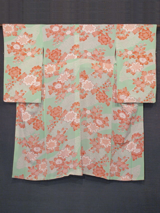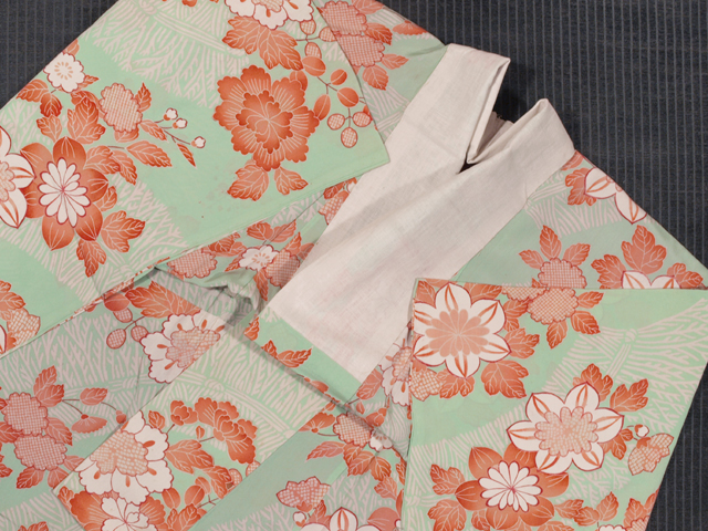やや沈んだ薄萌黄(うすもえぎ)色の地に、柴垣と花の文様が染められている、縮緬の長襦袢です。袷仕立てで、両前身ごろの胸下が約 3cm ほどつままれているので胸回りに余裕があります。 昭和初期ごろにつくられたと思われるアンティークのお品です。ふんわりとやわらかな手ざわりのシボのこまかな縮緬地です。胴裏地は紅絹です。 全体的にアンティークなりのうっすらとしたくすみが若干あるほか、ところどころにこまかなうすよごれ色うつりがありますが、そのほかに目につく大きなしみやよごれ、褪色などのダメージはなく、この時代のものとしてはきれいな状態なので、アンティークにご理解のある方であれば、お召しになれます。 |