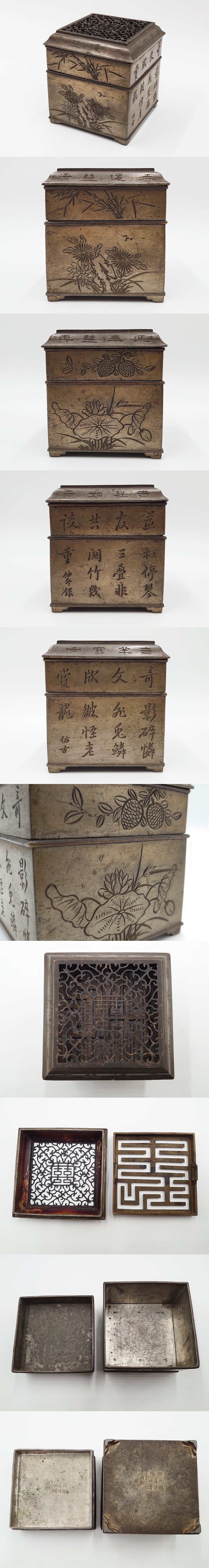 R-085508 中国製 潮陽・汕頭 二段構造 唐草透かし火屋を備えた点銅(點銅)香炉(香爐,2段,仏具,茶道具,香道具,東洋美術,花,竹,漢詩) 收藏