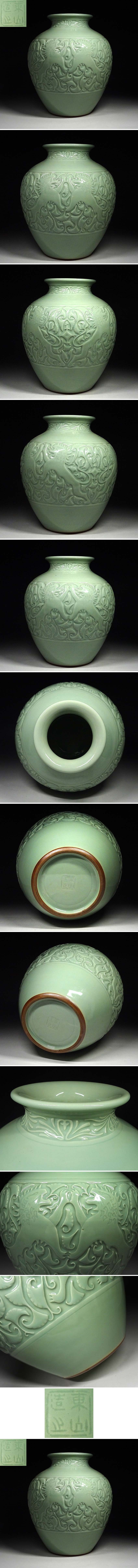 緑屋t■ 富永東山 青磁 陰刻 花瓶 高約32cm i9/12-6358/14-3#120 收藏