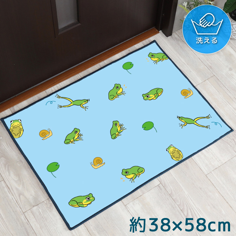 玄関マット おしゃれ 室内 洗える 約38×58cm キッチンマット アクセント かわいい 転写プリント 敷物 TEN153 カエル いっぱい 雨 ブルー 收藏
