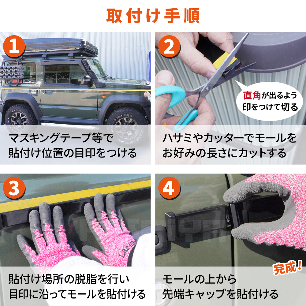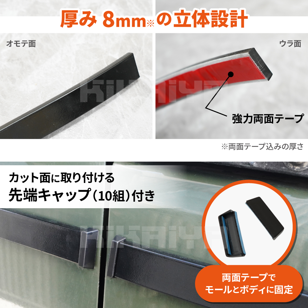 ●愛車のドレスアップパーツとして最適なパーツです ●様々な車種に適合します ●お好みの長さにカットしてご使用ください ●カット面に取り付ける先端キャップ(10組)付き ●裏面には強力両面テープがついており、貼るだけで取り付けができます ※貼り付け場所の脱脂を確実に行ってください ※取付説明書は付属しませんので当ページよりご確認ください ●厚み8mm(裏面両面テープ込み)の立体設計 |