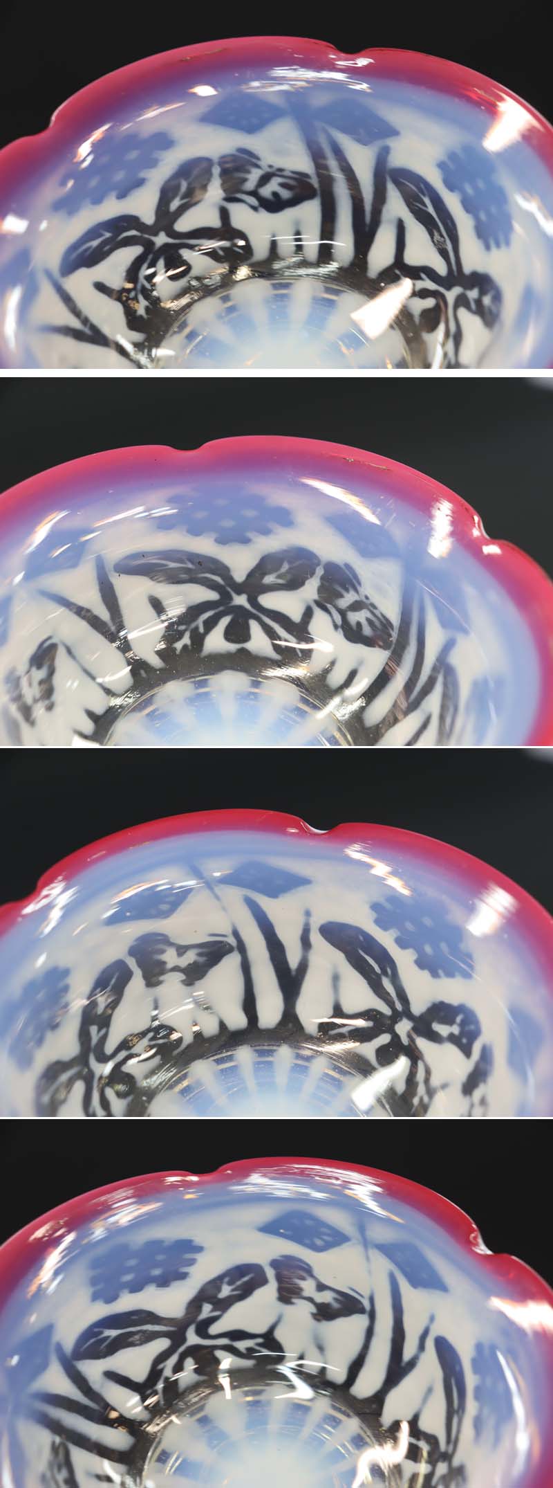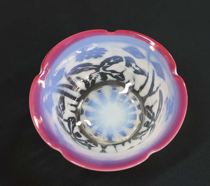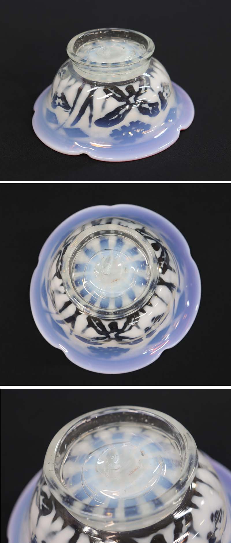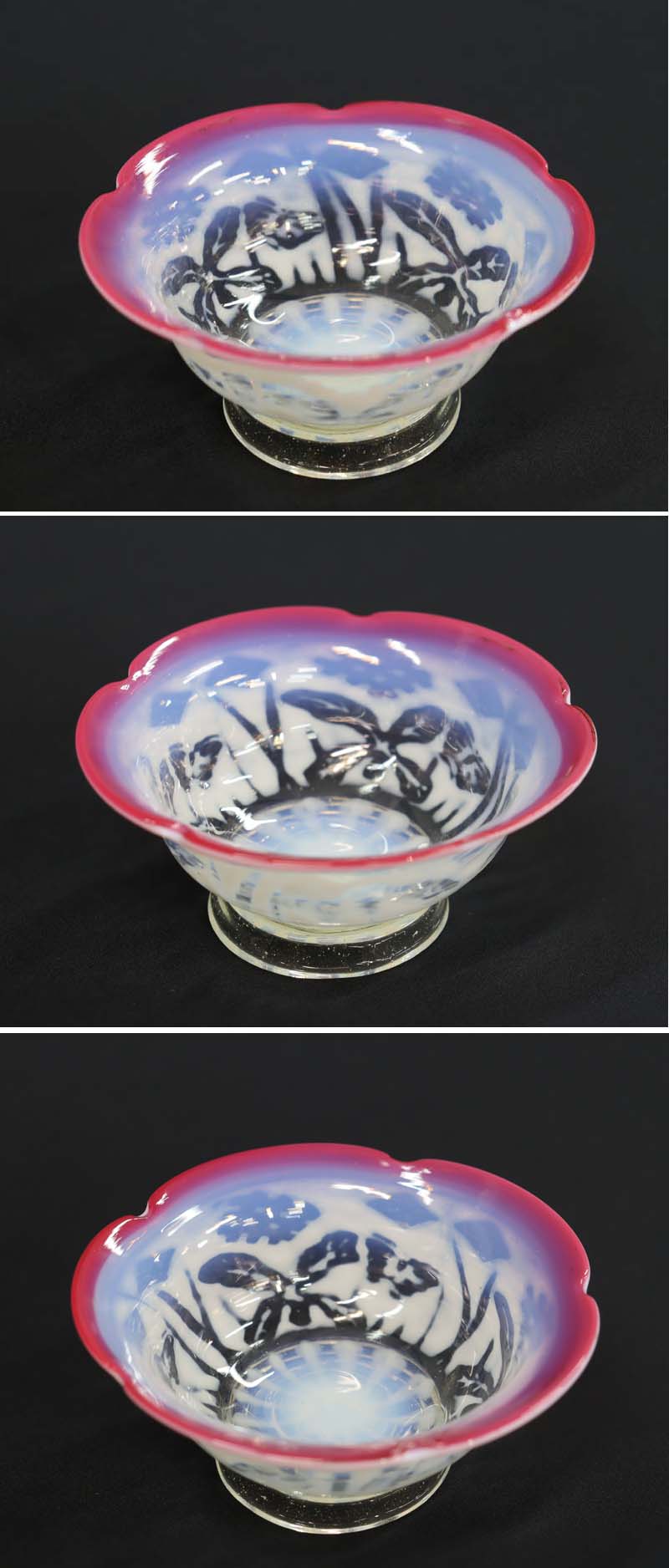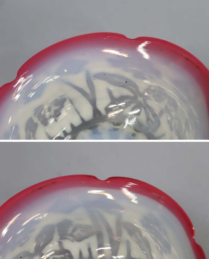 即決■ 大正ガラス ② 輪花形赤縁 乳白透かし菖蒲蝶文小鉢 径11.3cm 氷コップ 和ガラス 收藏