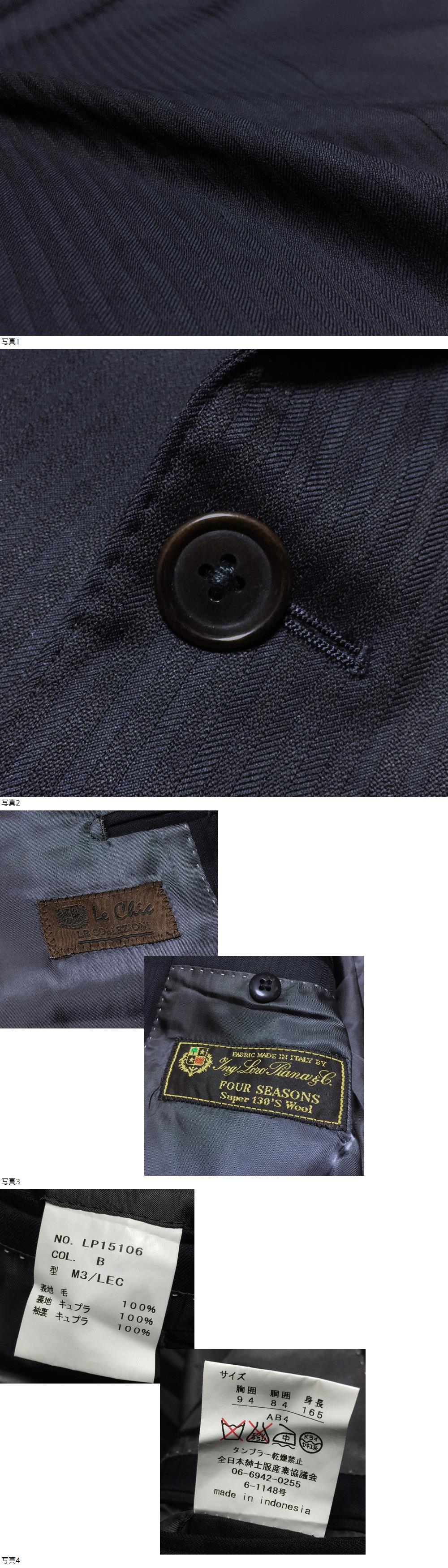 | 【ブランド】 Le Chic ル・シック× Loro Piana ロロピアーナ Loro Piana :1936年イタリア、クアローナにて創業の最高級カシミアと最高級ウールを取り扱い、ゼニアと共にイタリア生地ブランドトップ2として君臨している最高級服地メーカー兼プレタブランドです。 【デザイン・モデル】 FOUR SEASONS Super130’S Wool ウール ストライプ柄 本切羽 2B テーラードジャケット FOUR SEASONS Super130’S Wool:厳選されたニュージーランド産スーパーファインメリノウールを100%使用。最大の特徴はその組織感・光沢にあり、メリノウールの繊維が非常に細く、1キログラムの羊毛から100キロメートルの長さを紡ぐ事が出来る程。その糸を1/2のサージの織機で織り上げることで、原毛の持つシルクのような上品な光沢を醸しだし、クラシックでありながら、モダンテイストを表現。軽い着心地と、しなやかな肌触り、しかも最もラグジュアリーで上品さが魅力です。四季を通して快適に着用できるよう考慮された生地、シワの回復力に優れ、ビジネスシーンにも適しています。 【生産】 全日本紳士服産業協議会 【詳細・コメント】 Le Chic ル・シック テーラードジャケットになります。イタリア ロロピアーナ社の高級FOUR SEASONS Super130’S Woolウール地で仕立てた、ストライプ柄の光沢・艶のあるロロピアーナらしい上品な素材感で高級感溢れる逸品。美しいシルエットでワンランク上のジャケットスタイルを演出して頂けます。仕立ては、シングル2ボタン、袖口は本切羽4ボタン、総裏地、サイドベンツです。 正規品です。 【サイズ】 表記: AB4 (胸囲94 胴囲84 身長165) ※実寸を参考にして下さい。 平置実寸:身幅50㎝ 着丈70cm 肩幅44㎝ 袖丈59㎝ ※多少の誤差はご了承ください。 【カラー・パターン】 ブラック × ネイビー シャドーストライプ柄 ※ご覧になられるモニターや、デジカメの撮影具合によって色味が異なる場合がございますのであらかじめご了承ください。 【品質】 表地:毛100% 裏地:キュプラ100% 【コンディション】 USED 中古品 です。多少の使用感ございますが、目立ったダメージは無くきれいです。まだまだ着ていただけます!※写真参考に判断して下さい。ユーズドアイテムにご理解ある方のみご入札お願い致します 。 | |||