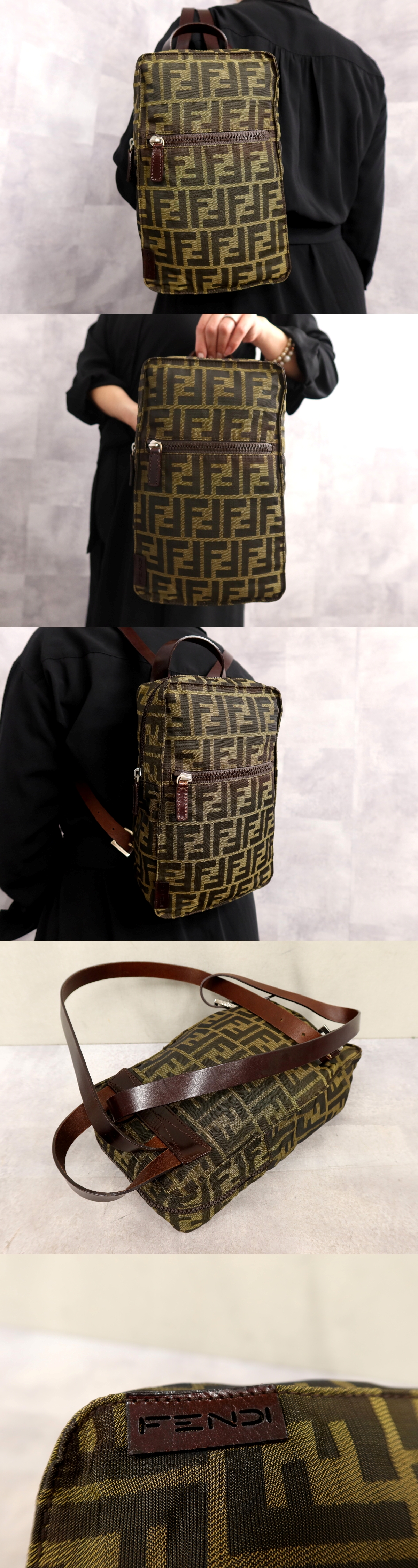 ●超美品●FENDI フェンディ●ズッカ●FFロゴ●ナイロンキャンバス カーフ レザー 本革●リュックサック●カーキ系 黒●SV金具●Js66759 收藏