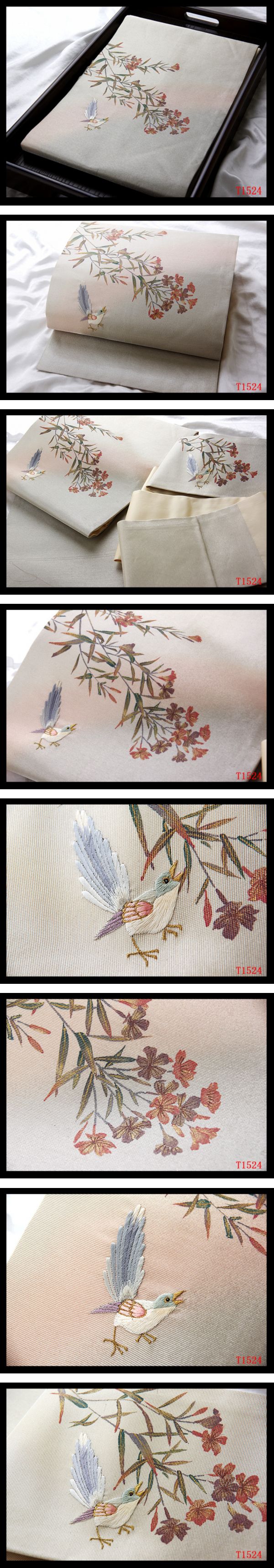 蔵【T1524】厳選逸品 刺繍 花鳥文様 卯の花色地 気品豊かに 正絹高級美術名古屋帯 ◇検◇簪着物袋帯和装小物帯締め 收藏