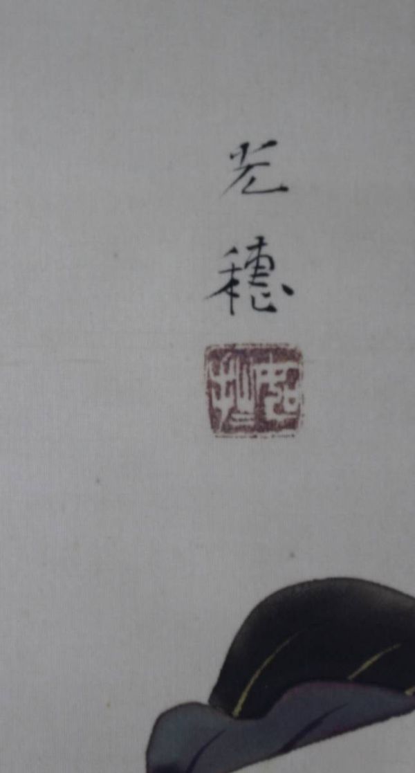 《真作》★佐野 光穂【茄子にバッタ】(仮題)*掛軸.横幅.桐箱入*師 菊池契月.西山翠嶂*帝展*日本美術院*時代作家*長野.物故*[桃] 收藏