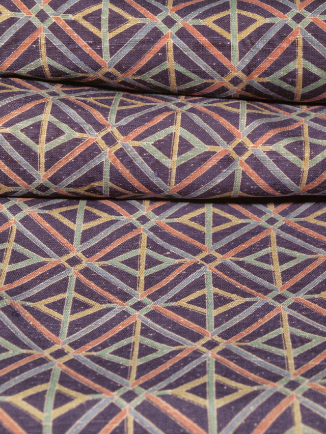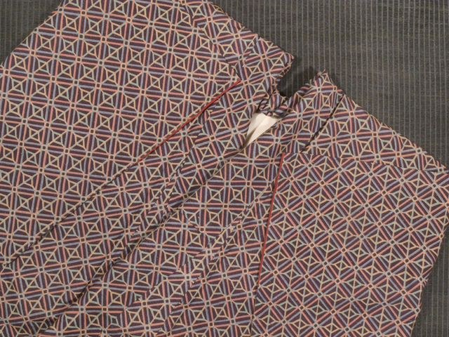 滅紫(けしむらさき)色の地に、幾何学的にあらわされた菱の配されている襷(たすき)の文様が型染めされた染め紬です。袷仕立てです。 キッチュなカラフルさの感じられるお色目にモダンなかわいらしさが感じられます。ややほっこりとしたやわらかな手ざわりの紬地です。 ユーズド品で、両袖口裏へりにうすよごれがあります。また、胴裏がうっすらとくすみ、腰下付近に長さ約 20cm の補修跡が 2 か所あるほか、同じく腰下に直径約 10cm のうっすらとした黄変が 1 か所あります。ところどころに直径約5mm-1cm 前後の黄変があります。そのほかに目につくしみやよごれ、褪色などのダメージはなく、表地はきれいな状態なので、気にされない方であればご着用は可能です。 |