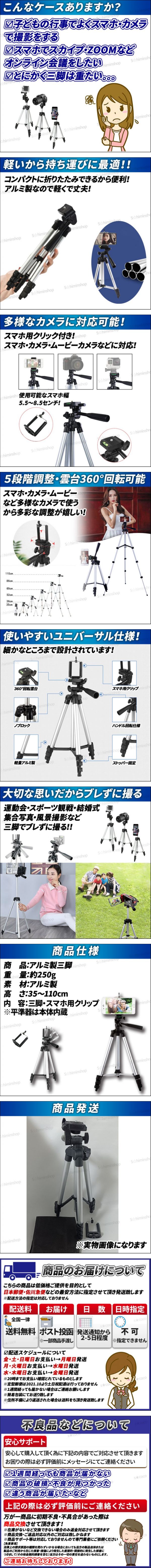 | カメラ スマホ ビデオカメラ 三脚 軽量 5段階高さ調整 水準器付 アルミ製 折りたたみ 角度調整 一眼レフカメラ 運動会 動画撮影 スマホ固定 | ||