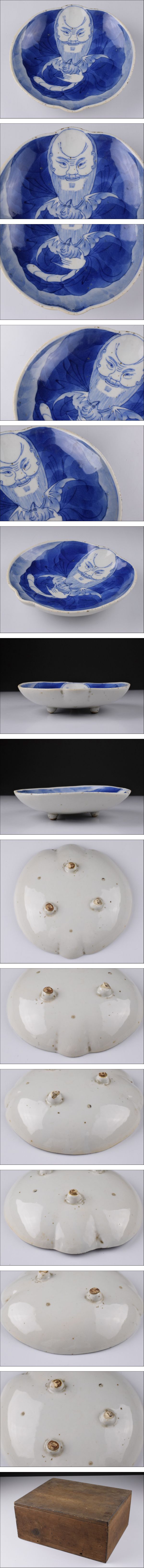 | 品 名:中国古美術 古染付 青花 蝙蝠寿老人図 足付 皿 箱付 寸 法:高さ 3.5㎝ 幅 14.8㎝×15㎝ 総重量:257g 状 態:経年による汚れ小傷あり。 | |||
