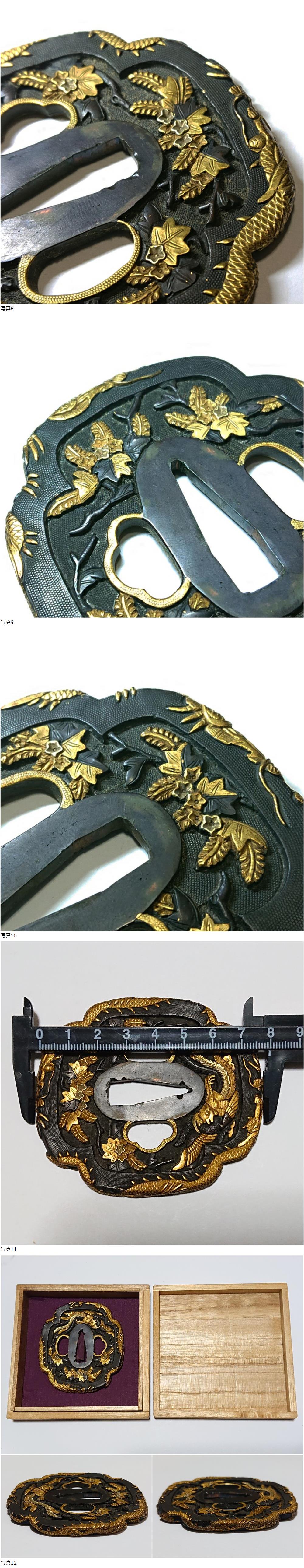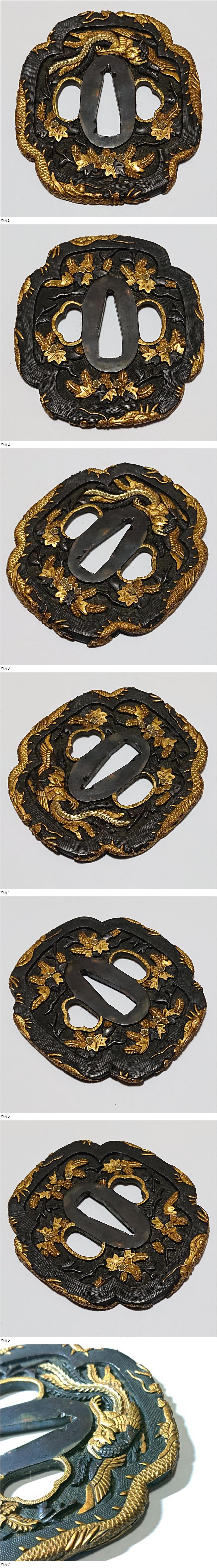 極上 無銘 刀装具 鐔 美濃 桐鳳凰龍図 赤銅魚子地 木瓜形 金銀色絵 大刀用 江戸時代 本歌 鍔 收藏