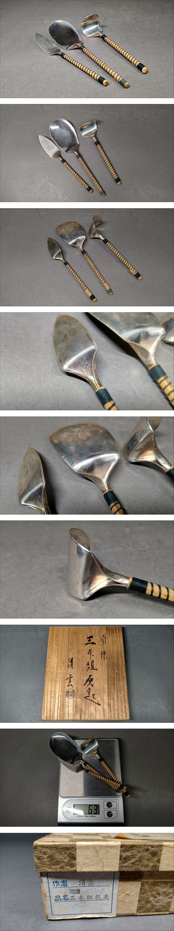 【茗】木村 清雲 造 南鐐 純銀 三本組 灰匙 総重量 63g【竹影堂 刻印 清五郎 象嵌 金 湯沸 銀瓶 煎茶 浄益 鉄瓶 ひしぎ 薬缶】 收藏