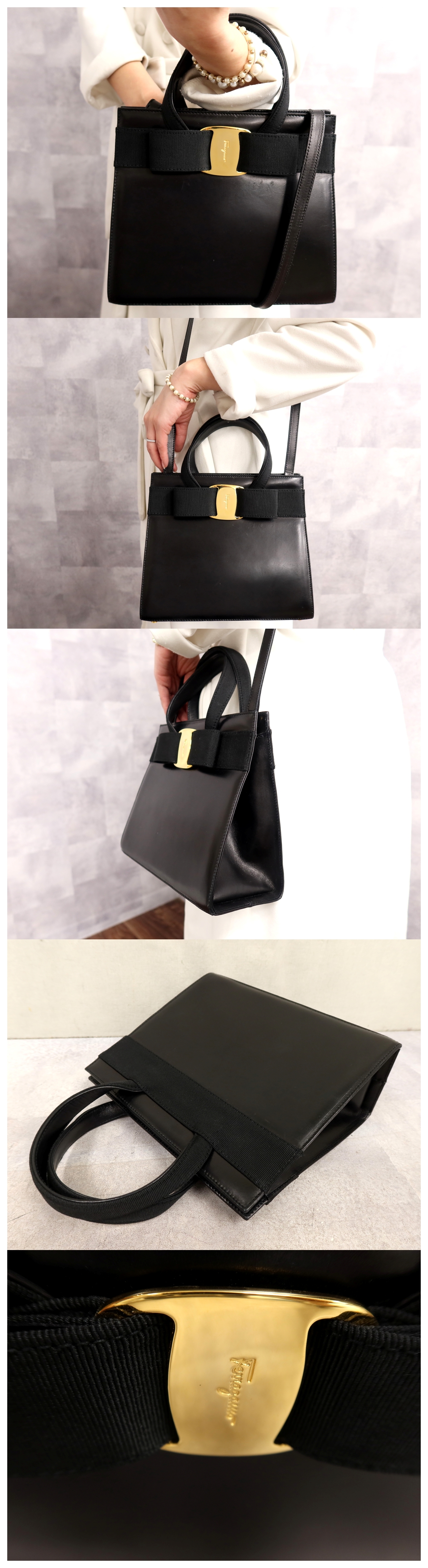 ●超美品●Salvatore Ferragamo フェラガモ●ヴァラリボン●カーフ レザー 本革●2way ハンド バッグ●黒●ゴールド金具●腕掛け●Js65082 收藏