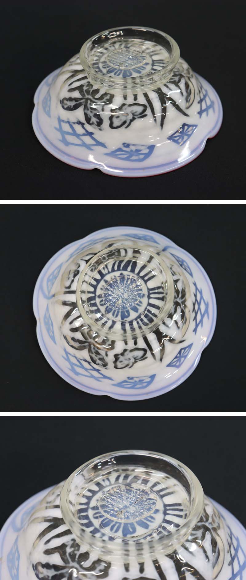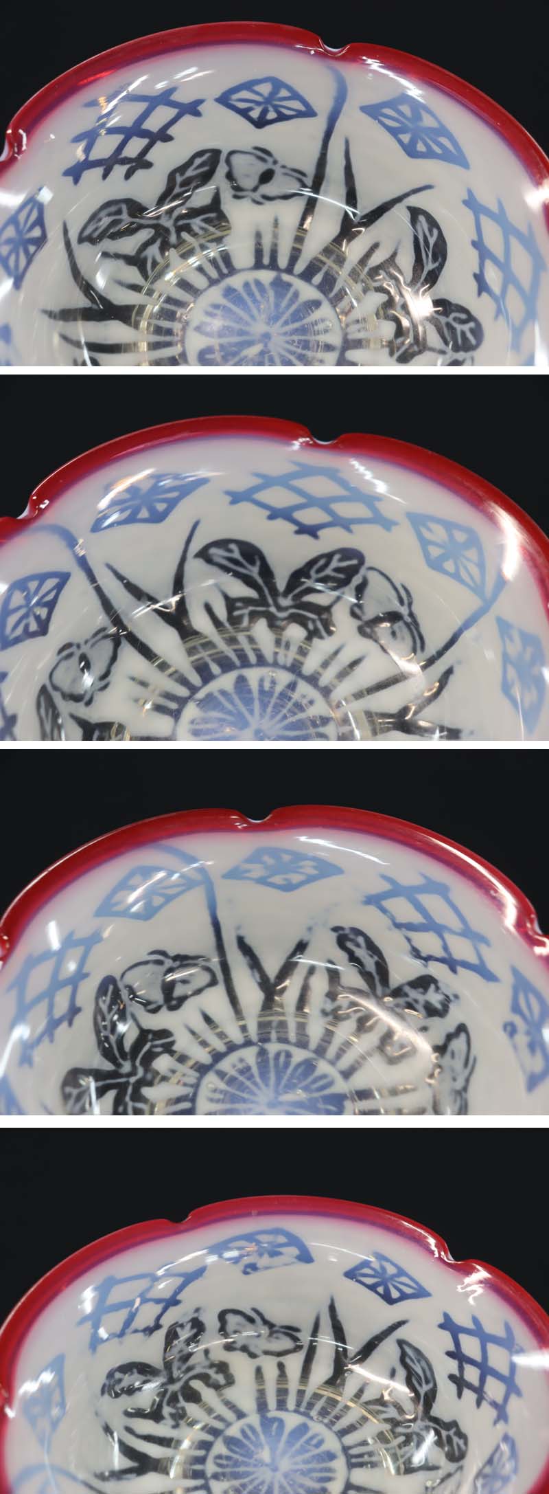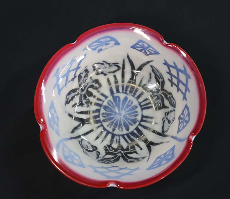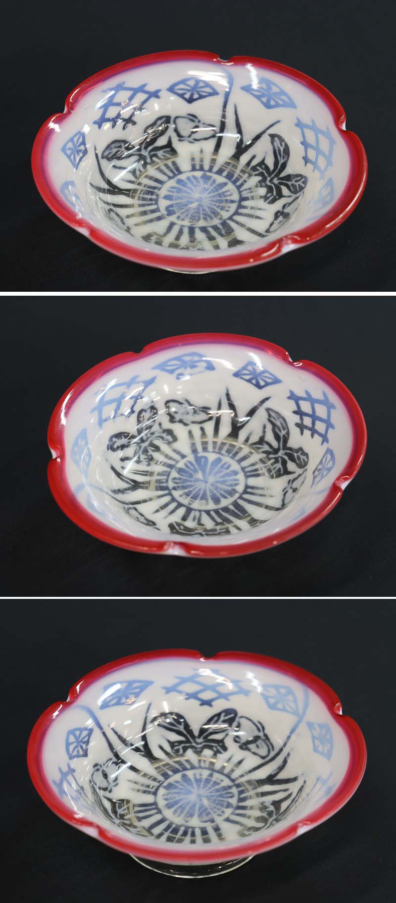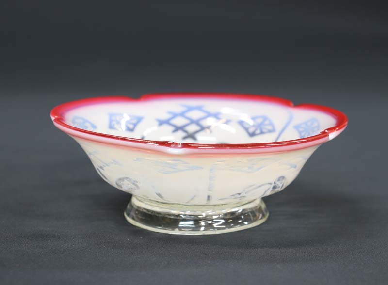 即決■ 大正ガラス ④ 輪花形赤縁 乳白透かし菖蒲蝶文中鉢 平鉢 径15.1cm 氷コップ 和ガラス 收藏