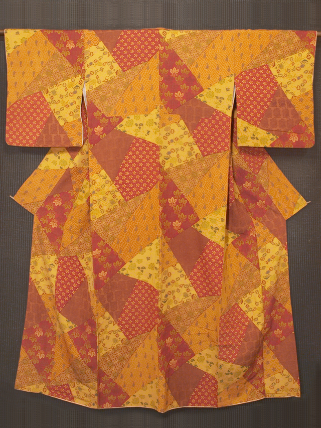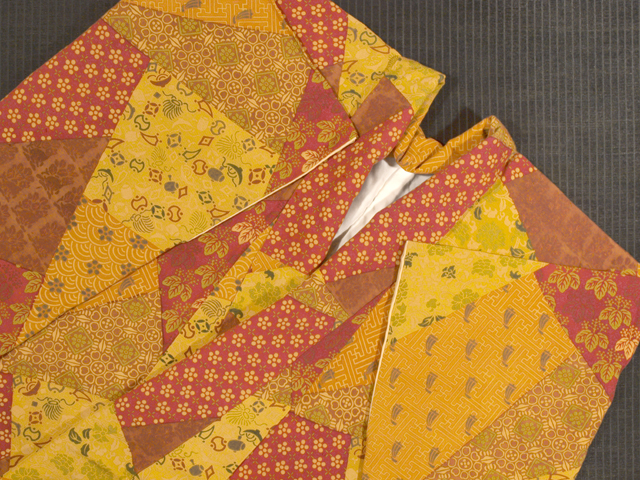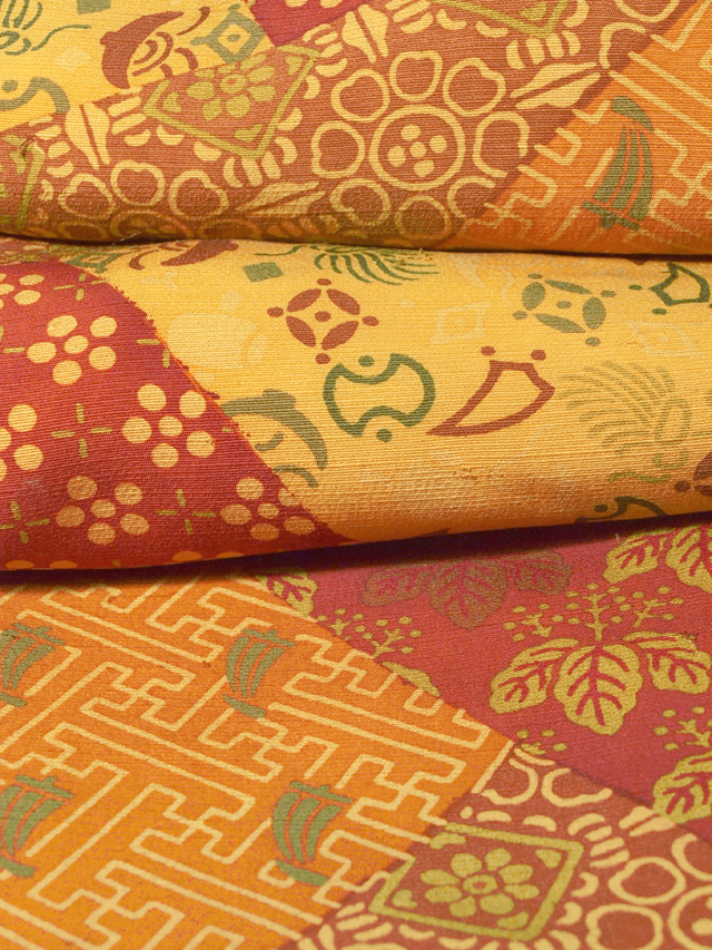 柿渋色や沈んだ飴(あめ)色、深く沈んだ濃緋(こきひ)色、沈んだ丹(に)色、雀茶色などの地に、宝尽くしやきり、紗綾形(さやがた)に帆掛け舟などの小紋が寄せ染めされた、染め紬です。袷仕立てです。 素朴な趣で染められたさまざまな文様におもしろみが感じられます。ややさらり、ややほっこりとした手ざわりの紬地です。深みとあたたかみのあるお色目です。 ユーズド品で、袖口へり裏にうすよごれあるほか、胴裏の腰下に直径約 1cm のうすじみが 1 か所あります。また、全体のところどころにひげ紬のような節があり、そのひげのような糸の飛び出しによるこまかな染め抜けがちらほらとありますが、目にはつきません。そのほかに目につく大きなしみやよごれ、褪色などのダメージはなく、全体的にはきれいな状態なので、気にされない方であればご着用可能と思われますが、状態ランク=「D」のご着用対象外、リメイク素材用とさせていただきます。 |