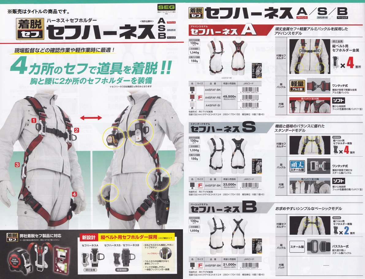 タジマ TAJIMAセフハーネスA フリーサイズ 黒A4SFAF-BK現場監督などの確認作業や軽作業時に最適!■機能・縦ベルト用セフホルタ?ー金属×4個を胸部・腰部に標準装備!・アルミ製ワンタッチ式腿バックルを採用したアドバンスモデル・セフホルダーに工具が収まるので、胴ベルト無しで腰周りスッキリ・腰のセフホルダーは胴ベルトを通せるので、普段の腰周りも装着可能・体の動きを妨げないアクティブフィット構造・どんな体型にもフィットするフリーサイズ・使用可能質量:130kg以下■仕様・種類:フルハーネス型タイプ1・使用可能質量:130kg以下・ハーネス単体重量:1,190g・付属パッド重量:150g■材質・ベルト:ポリエステル・肩バックル:アルミ・腿バックル:アルミ・胸バックル:アルミ・D環:スチール■付属品・セフホルダー縦ベルト用 金属 フィット4個・肩パッド ソフト Y型2