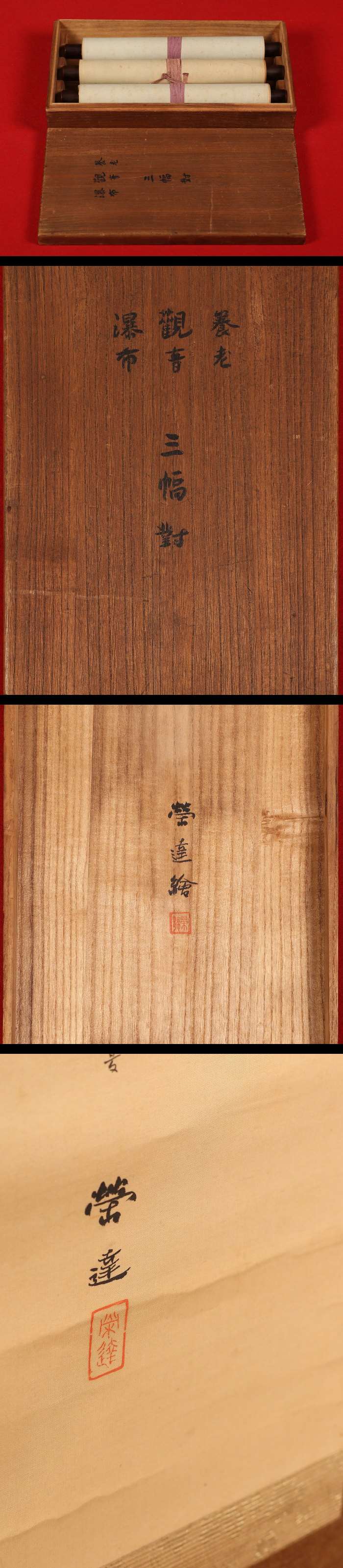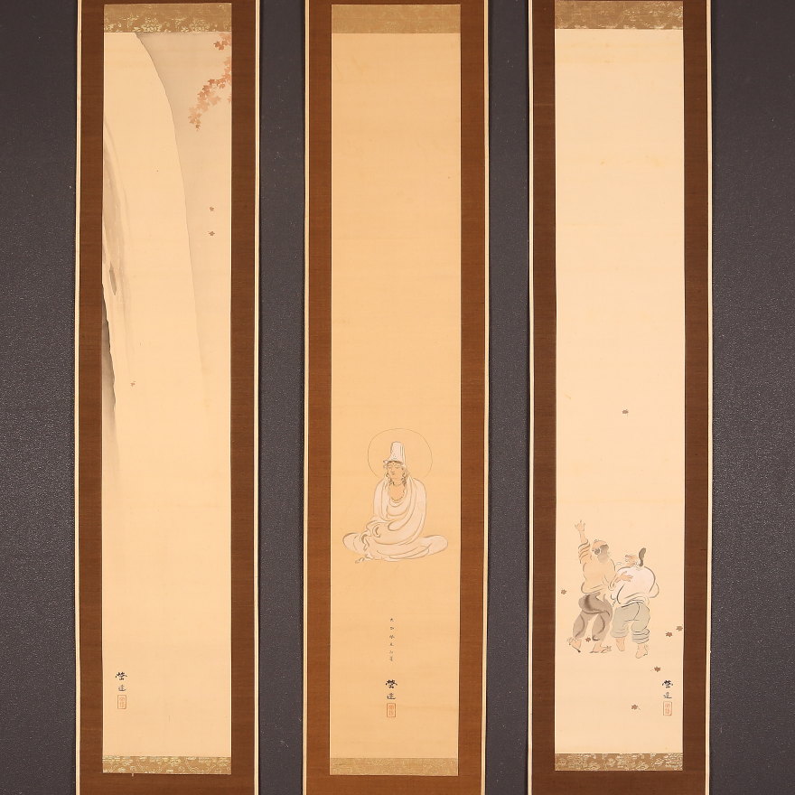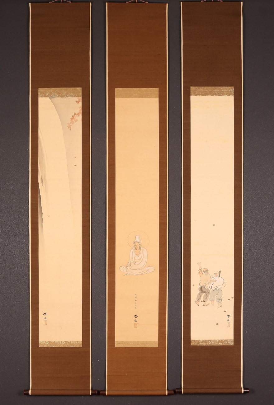 【模写】【伝来】am7980〈小山栄達〉三幅対 白衣観音に養老の滝図 仏画 共箱 小堀鞆音師事 明治時代 東京の人 物語絵 收藏