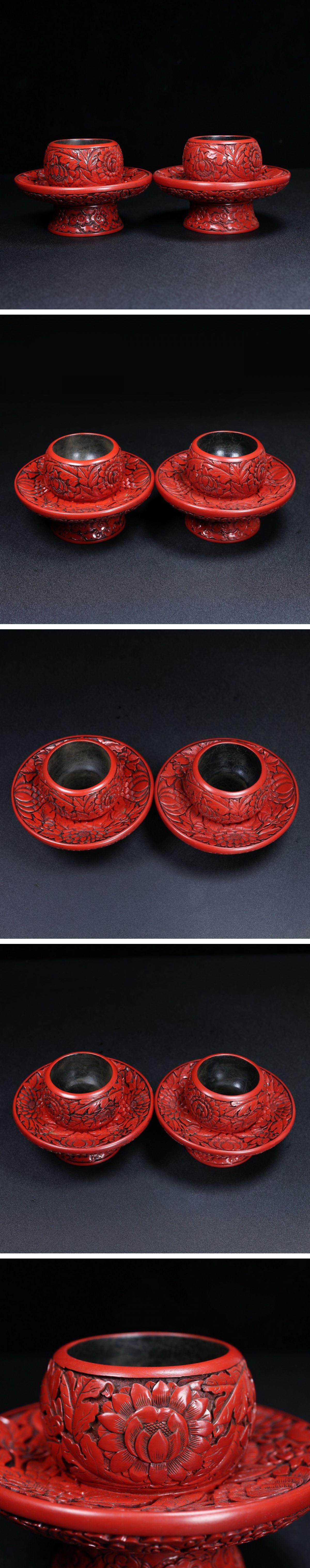 【清】関西某オークション購入 中国・清時代 堆朱雕漆 花卉紋天目台一双 極細工 古置物 古擺件 中国古美術7L12-YS3