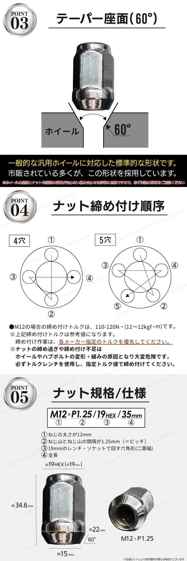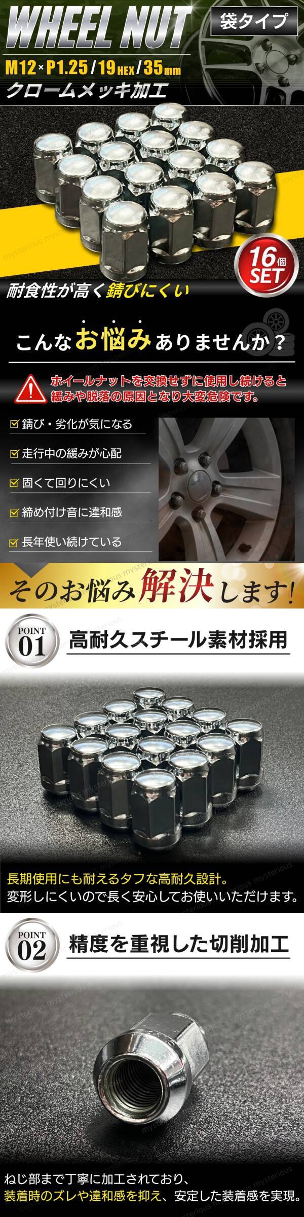 ホイールナット スチールナット M12 P1.25 16個 セット 35mm 19HEX 袋 テーパー ボルト クロム ニッサン スズキ スバル 日産 冬タイヤ 4穴