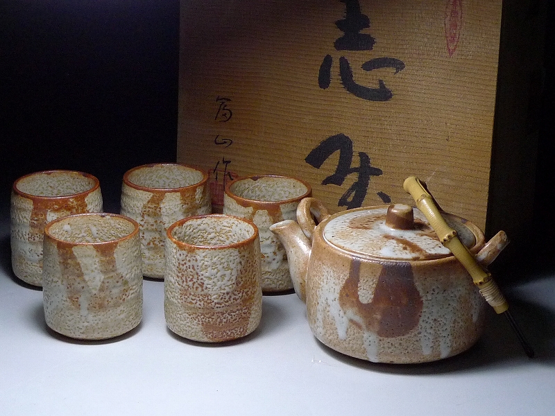 8027H10*1C▲志野焼 富山窯 富山作 志生 茶器 急須 湯呑 五客揃 共箱 陶器 收藏