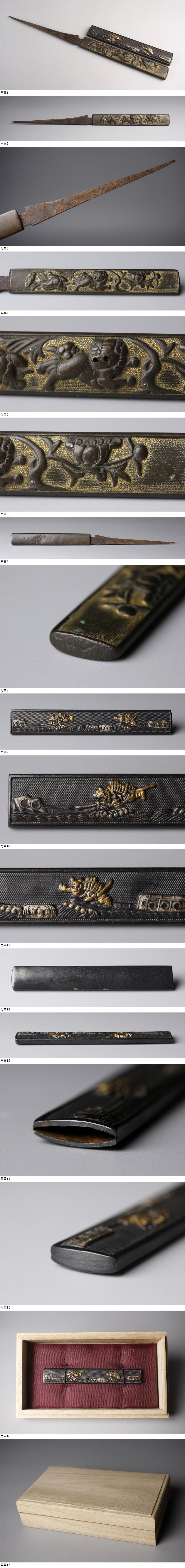 26010621* * * 商品詳細 * * * ここでしか出逢うことのできない唯一の美をご紹介させて頂きます。 時代感のある重厚な肌地、細工も細やかで雰囲気があります。 鈍く輝く金色は鮮やかで一層華やかに、力強く魅力を引きたてます。 一朝一夕では生み出せない深い趣きが感じられる逸品です。 ■商品内容/小柄 二点、箱 1点 ■サイズ/全長20cm×縦1.5cm(小刀付) 横9.5cm×縦1.5cm ■状態/経年による傷み、スレ、キズ、サビ、へこみがございます。 ※写真にてご確認、ご了承の上ご入札下さい。 * * * 支払詳細 * * * !かんたん決済 * * * 発送詳細 * * * 入金確認後3営業日以内に発送致します。 ※直接引き取りも可能です。 60~160サイズにつきましては 佐川急便、ゆうパックのどちらかで発送いたします。 ゆうパック発送の場合、弊社の発送日から追跡サービスに問合せ番号が反映されるまで 約1日ほどお時間がかかりますのでご了承下さい。 * * * 注意事項 * * * 運送中の破損があった場合は速やかに当社までご連絡下さい。 保険を利用するのに受取連絡後に運送会社による現場での破損状況確認が必要となります。 勝手に返送されますと保険の適用外となりますのでご注意ください。 * * * * * * お問い合わせ:082-236-8669 |