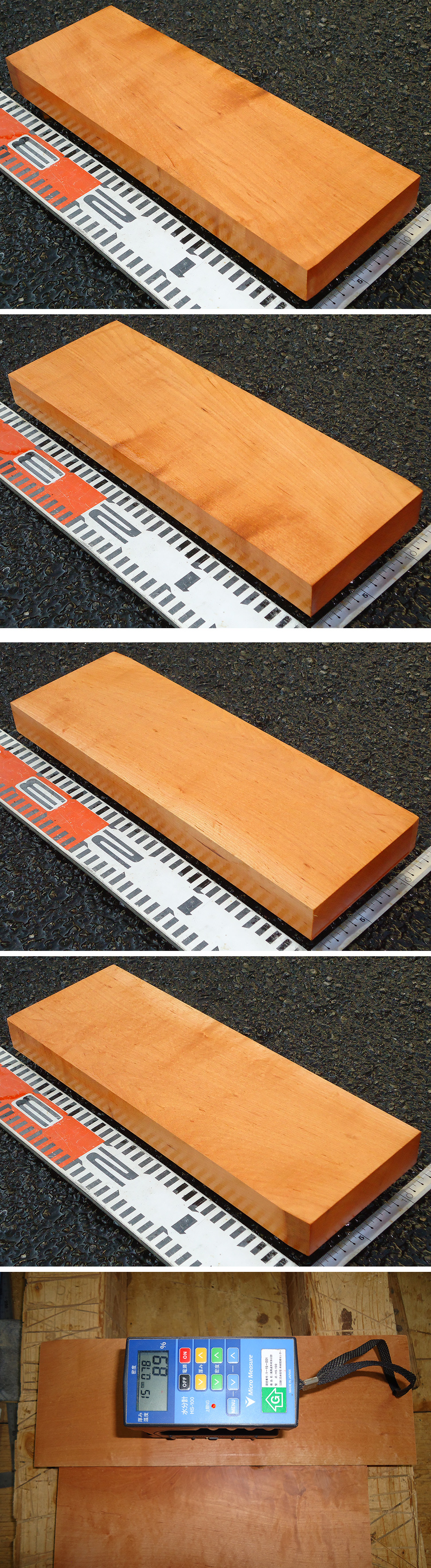 ・光沢ある木肌に飴色、杢目が美しい素材で、欠点は少なく乾燥状態も良好です。また、加工時には甘酸っぱい爽やかな香りがします。