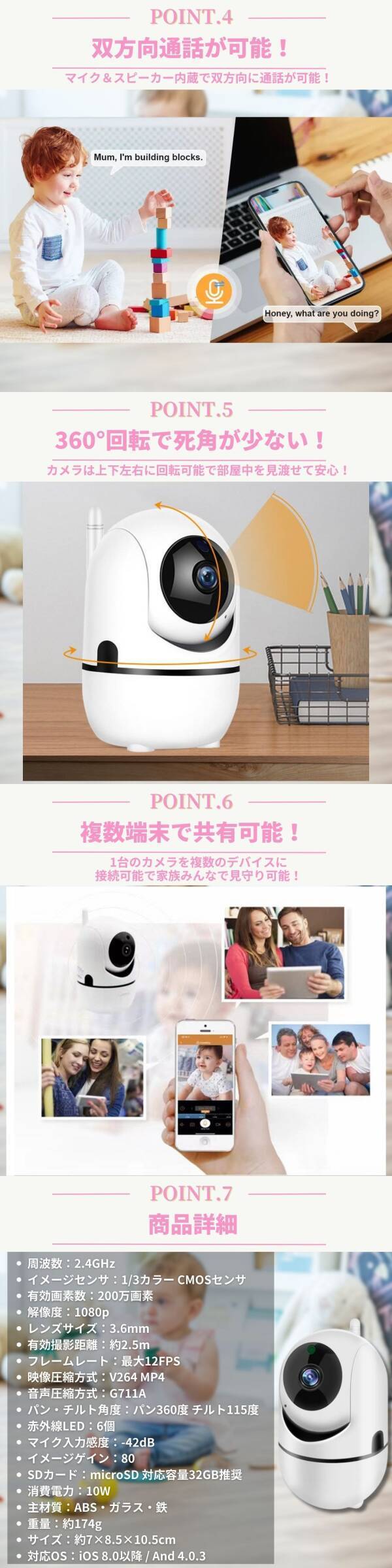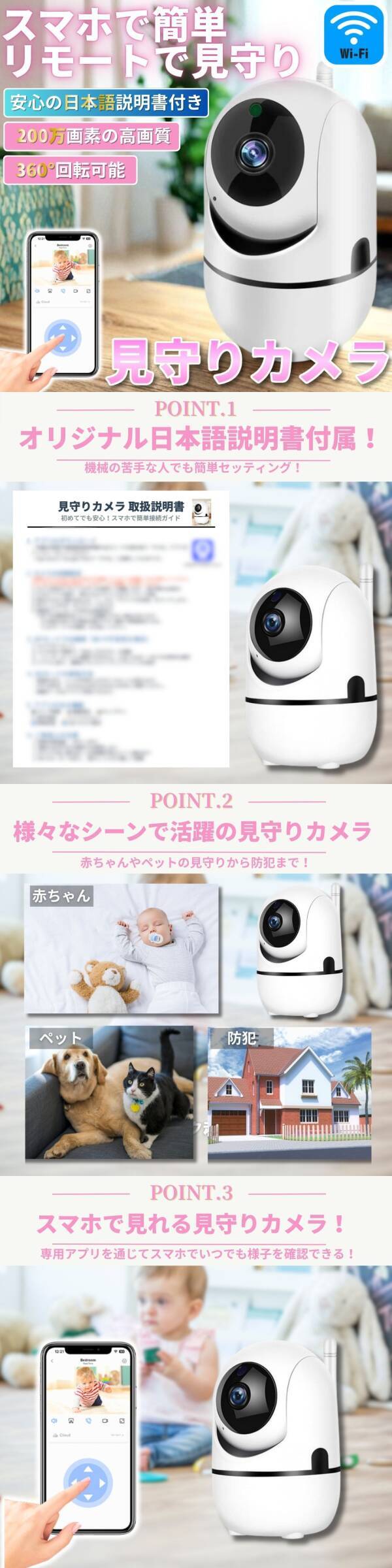 見守りカメラ ペット 赤ちゃん ワイヤレス 監視 モニター WIFI ネットワーク ベビー 室内 高画質 遠隔操作 IP IOT 録画 リモート スマホ 收藏