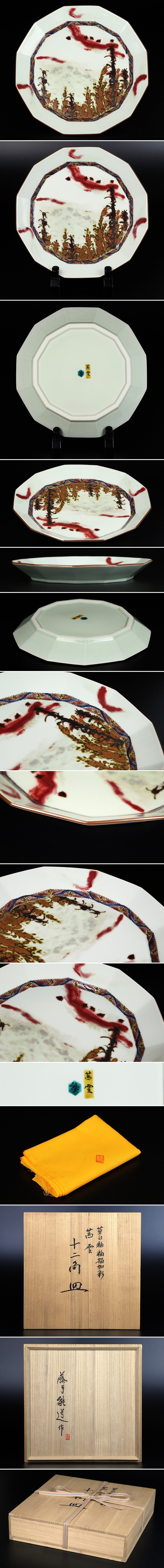 【 藤本能道 】最上位作 草白釉釉描加彩茜雲十二角皿 直径39.2cm 人間国宝 共箱 保証