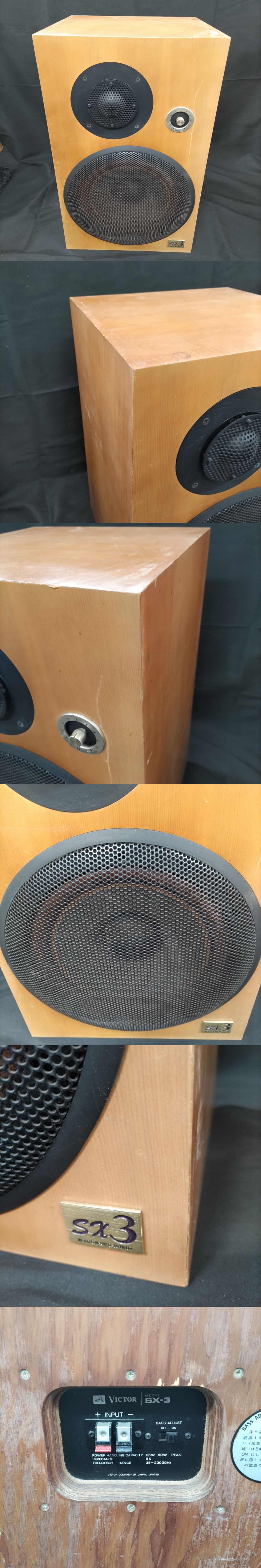 | ※必ず最後までお読みください。 Please be sure to read to the end. 一定要到最后※ | 商品概要 | 数あるオークションの中からこちらの商品をご覧頂きまして誠にありがとうございます! ※商品説明と注意事項を必ず全てお読み頂いた後にご入札下さい※ 引き続き 安心できる気持ちの良いお取引を心掛けてまいりますのでどうぞ 宜しくお願い致します! 色んなジャンルの商品を多数出品しておりますので、こちらをクリックしてご覧ください!! 東京都公安委員会 古物商許可 第307781505147号 ◎ビクター◎VICTOR SX-3 SXシリーズ第一作 25cmコーン型ウーファー搭載 即発送 3 ※最下部にも写真掲載中なので必ずご覧下さい。 【商品概要】 ビクタースピーカーのSXシリーズ第一作として発売されたスピーカーシステム。 ウーファーには25cmコーン型ウーファーを搭載しています。 このユニットのコーン紙にはドイツ・クルトミューラー社製KDUコーン紙を採用してます。 中高域には5cmソフトドーム型トゥイーターを搭載しています。 ソフトドーム振動板は柔軟性に富むドーム状構造を採用しており、硬質振動板では達成できなかった球面波形を実現しています。また、ドーム素材には均一に織られた布地を採用しており、伸縮をさまたげない構造となっています。 さらに、柔軟性に富むゴム系ダンプ材を使用することで硬い振動板が持っている固有共振を持たないという特徴を得ています。 トゥイーターの前面にはワンタッチで取り外しが可能なディフューザーを装備しています。 ネットワークにはケイ素鋼板コアを用いたコイルを採用しており、大入力時の非直線歪を低減してます。また、直流抵抗値はスピーカー抵抗値の1/20以下に設計されており、アンプのダンピングを損なうのを防いでいます。 キャビネットにはフロントバッフルとリアバッフルに北米産針葉樹ダグラスファー合板を使用しています。また、キャビネットの縦方向と横方向の音の伝播速度を等しくするため響棒を採用しており、響きの美しいキャビネットを実現してます。 さらに、内部の吸音材には、1kHz以下の吸音率が従来のグラスウールの2~3倍もあるエステルウールを採用しています。 外観の仕上げにはスプルースを採用しており、ハイソリッド・フラット・クリアー塗装で傷をつきにくくしています。
