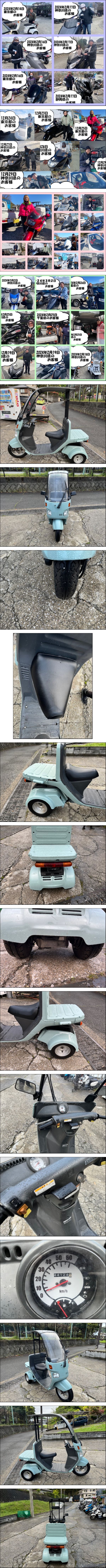| 神奈川県横須賀市からの出品です現地クレジットカード決済対応しています(Visa/Mastercard)半額現金、半額クレカなどでも対応できます。もちろん全額クレカでも大丈夫ですクレカは4%の手数料頂きます。 利用規約は必ずお読みください こちらにあります 商品説明は最後までお読みください 必ず動画も確認してください。 他に修理したほうが、いいとこありますか?交換必要箇所教えてくださいなど良く質問いただきます、不具合確認していれば治してから出品しています。もしくは動画でご説明しています 出品から陸送までにコンディションが変わる車両もあります。 その時点で不具合発覚しましたら治してから陸送出しています。 陸送に出す前にも確認しております。不具合なく乗れるように努めています。 しかし年間1500台販売しております。こんなタイミングで!!予想もつかない消耗品が壊れることもあります。中古である以上値段の高い中古を買ってもありうることです。 消耗品は壊れたら交換すればいいだけです。中古です消耗品は必ず出ます。 それで廃車だの言う方は新車買ってください。 お近くの方は当店にお持ちください。遠方の方は症状を、お電話くださいアドバイスいたします。 質問、現車確認等は予約はお電話下さ。営業時間外は電話は事務所ですので出られません 残業してるときは出られる時もありますが定休日は電話出れません 090-3336-6630 営業時間 10時~17時 お昼休み 12時~13時 定休日 火曜日 第4水曜日 夏季休暇8/11-8/15 沖縄本島送料激安、約35000円ジャイロ3輪屋根付きバイク50000円から 新規の方評価20以下の方は2時間以内に取引情報の送信いただけませんと削除いたします お越しの際は 神奈川県横須賀市武5丁目9 武五丁目第三公園を目的地に来てください 公園沿いにバイク沢山並べていますので直ぐに解ります 090-3336-6630 外出することもありますので 来られる時間解りましたら ご連絡お願いします お引き取り、現車確認は16時までとなります。 営業時間 10時~17時 お昼休み 12時~13時 定休日 火曜日 第4水曜日 お引き取り、現車確認は16時までとなります。 現車確認は予約制となっております。必ずお電話で予約お願いいたします バイカーズクサマ 担当クサマ お電話受付10時~17時 定休日、営業時間外、お昼休みは電話に出られません。事務所に電話おいてますので。 090-3336-6630 動画で解りやすく安心してネットでバイクが買えるよう 努力しています、必ず動画で現状ご確認下さい 以外でも売っていますので取り消す場合が多いいです 気に入ったものあれば早めに落札下さい 僅差で現車確認された方に売れてしまった時は落札されましても お譲りできない場合もございますご了承ください。 安く出品していますが特に訳アリとかではありません 大量に販売していますので激安価格が実現できています 転売される方沢山いますが転売先から問い合わせ頂くことが増えてます 転売も構いませんが責任を持ってお願い致します 評価に関して 最近自分勝手な評価される方がいます、現状販売にもかかわらず新車を買ったかのような クレームを言ってきたり、この値段で新車クオリティー求めてる呆れた方が増えてます 店だから何言ってもいいやくらいの感覚であることない事書かれたりしています 来店された方からは良く、 このクオリティーこの値段で文句言うやついるの?などとよく言われます。 大事に乗りますなど励まされるお言葉も多数いただきます 喜んで買って頂く方ほとんどですが、一部の理解力のない方がいますので 評価頂いた方には評価いたしますが必ず同じ評価で返します 残念です。 自賠責保険も取り扱っています。 登録時コンビニに入れに行ったりするより楽です 登録書類到着したら。登録するだけ乗り出せます どこで入っても値段は同じですので お申し付けください登録書類と一緒に送ることもできるので 手間が省けて便利ですよ。 敷地内でテスト走行を行ってから出品しています 最低限、走る、曲がる、止まる、故障ないよう長く乗っていただけるよう出品していますが 全てをチェックしてる訳ではありません予期しないトラブルもございます 公道、長時間の走行テストはしていません自走で帰らる方はトラブルもあるかもしれません 自己責任でお願いいたします。故障の際お電話でクレーム言われても一切対応いたしません 自己責任で自走引き取りしてるわけですから。 例外として交換部品在庫切らせている時はそのまま格安で出品もしています お時間をいただければ有料ですが部品交換も致します またお客様の方で気になる部品あればブレーキパッドやタイヤなど 有料ですが交換してからお渡しも可能です 外装、タイヤ、距離など画像、動画でご確認ください 中古ですので誰が何時OIL交換したか解りません長く乗れるよう乗り出し前は最低限おOIL交換してからお乗りください 希望があればエンジンオイル交換2200円より承ります 自走引き取りの場合は近い遠いに関わ
