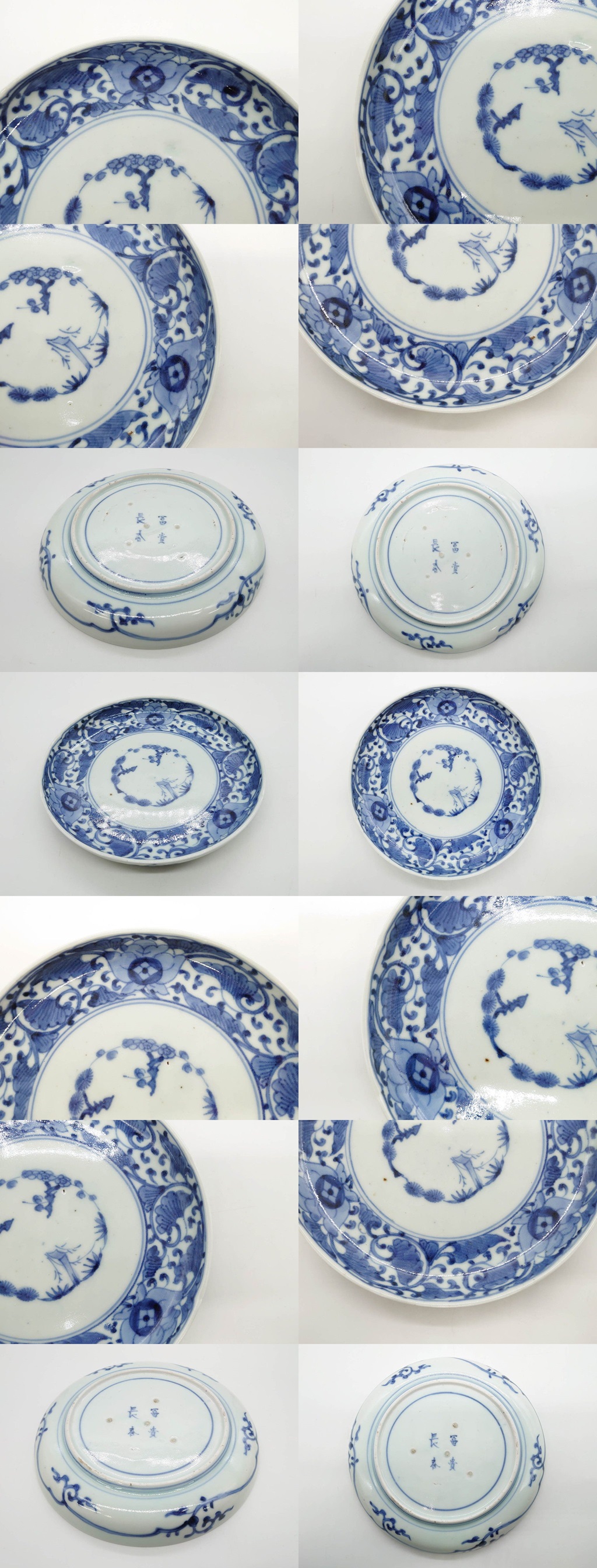 R-079573 江戸期 古伊万里 染付 冨貴長春 松竹梅 牡丹唐草文様 約17cm 5.6寸 中皿3枚セット(窓絵、和皿、和食器、五寸六分) 收藏