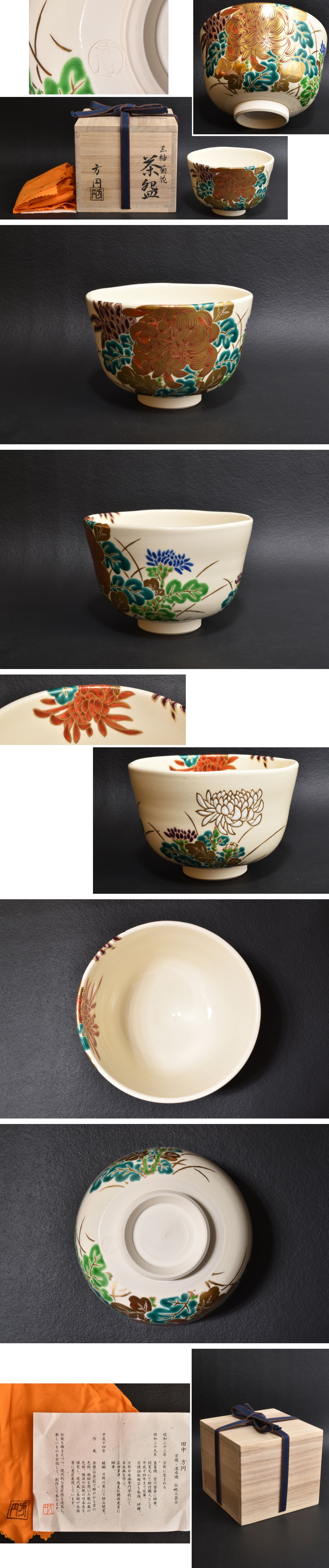 5742 田中方円 黒釉菊花 茶碗 無キズ 共箱 共布 美品 收藏
