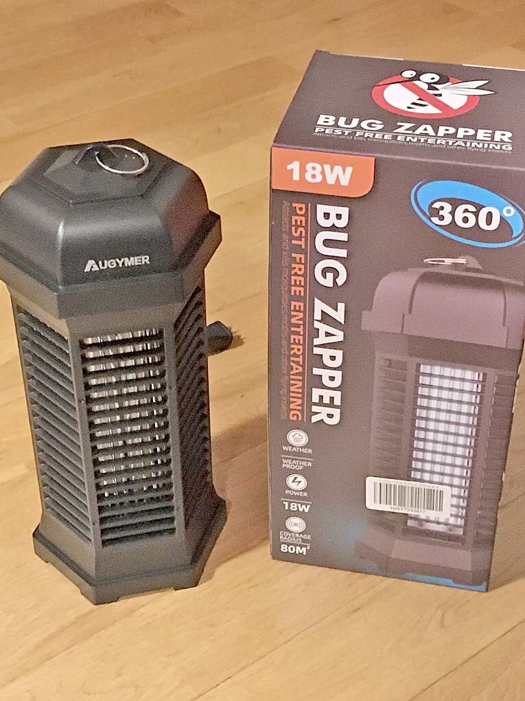 この誘虫灯は18Wの補虫蛍光管を内蔵してパワーアップ、従来品より有効範囲が広がりまして、360°全方位スキャナーしたりして蚊などを誘惑します。