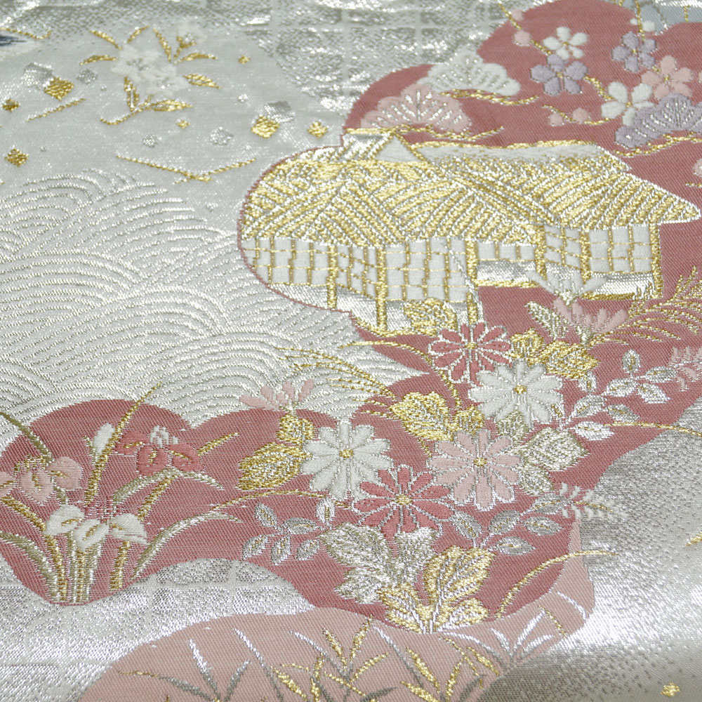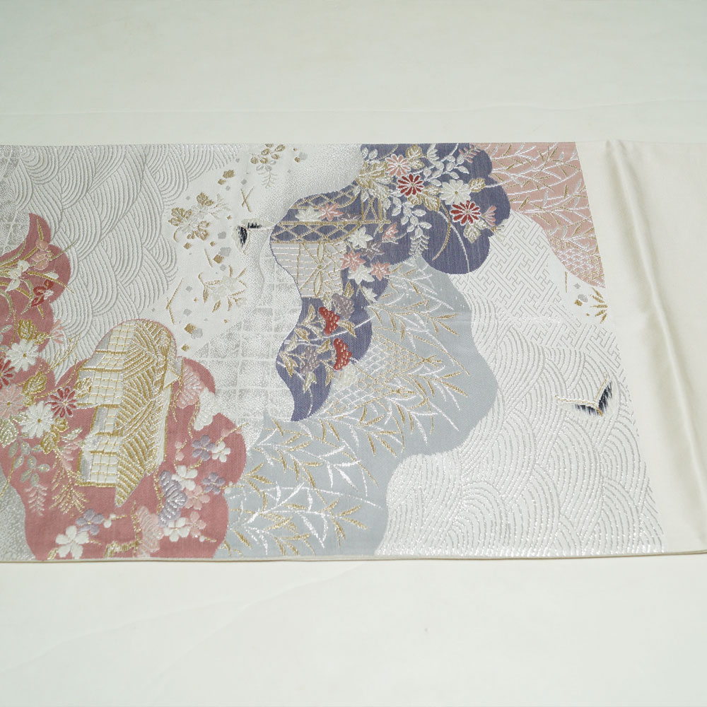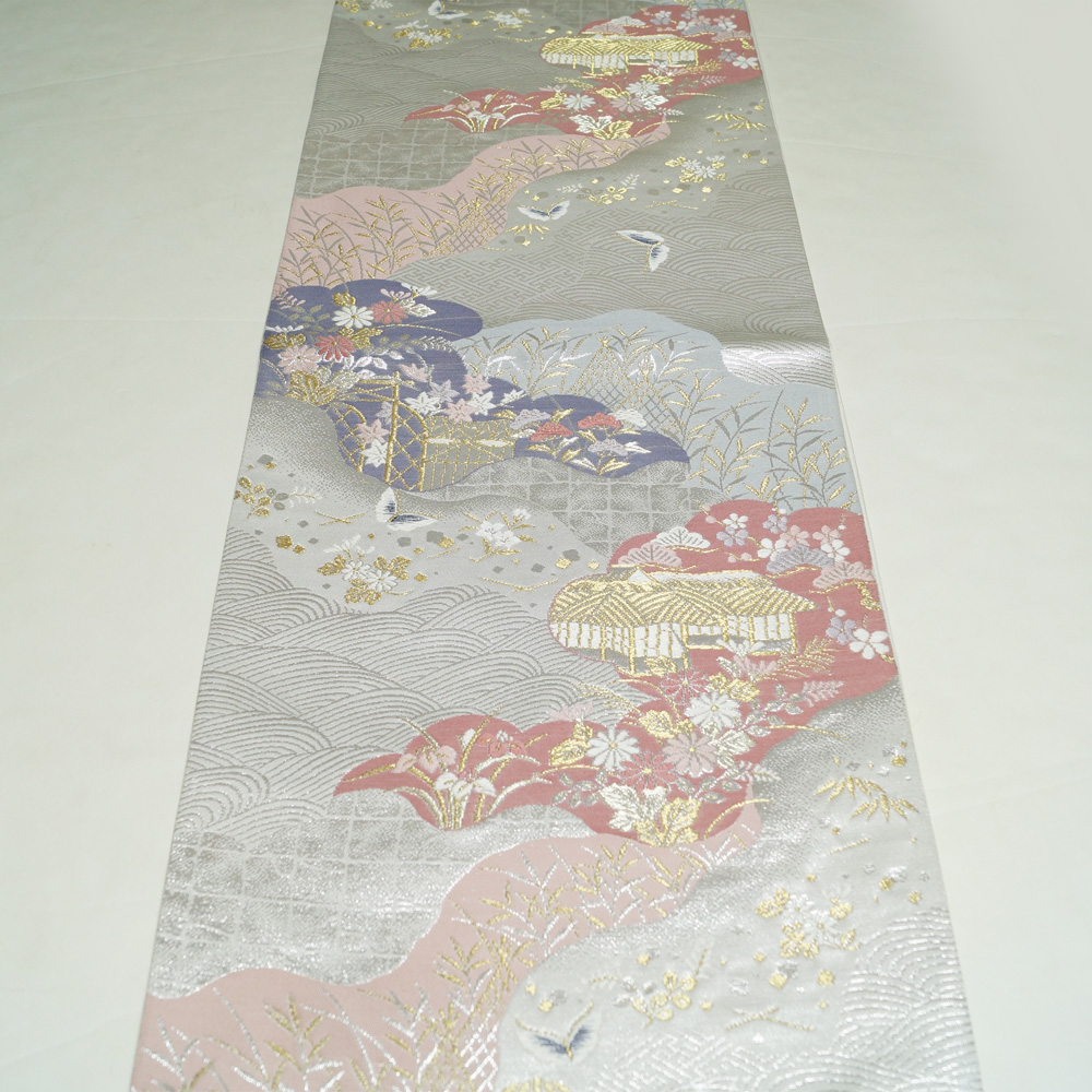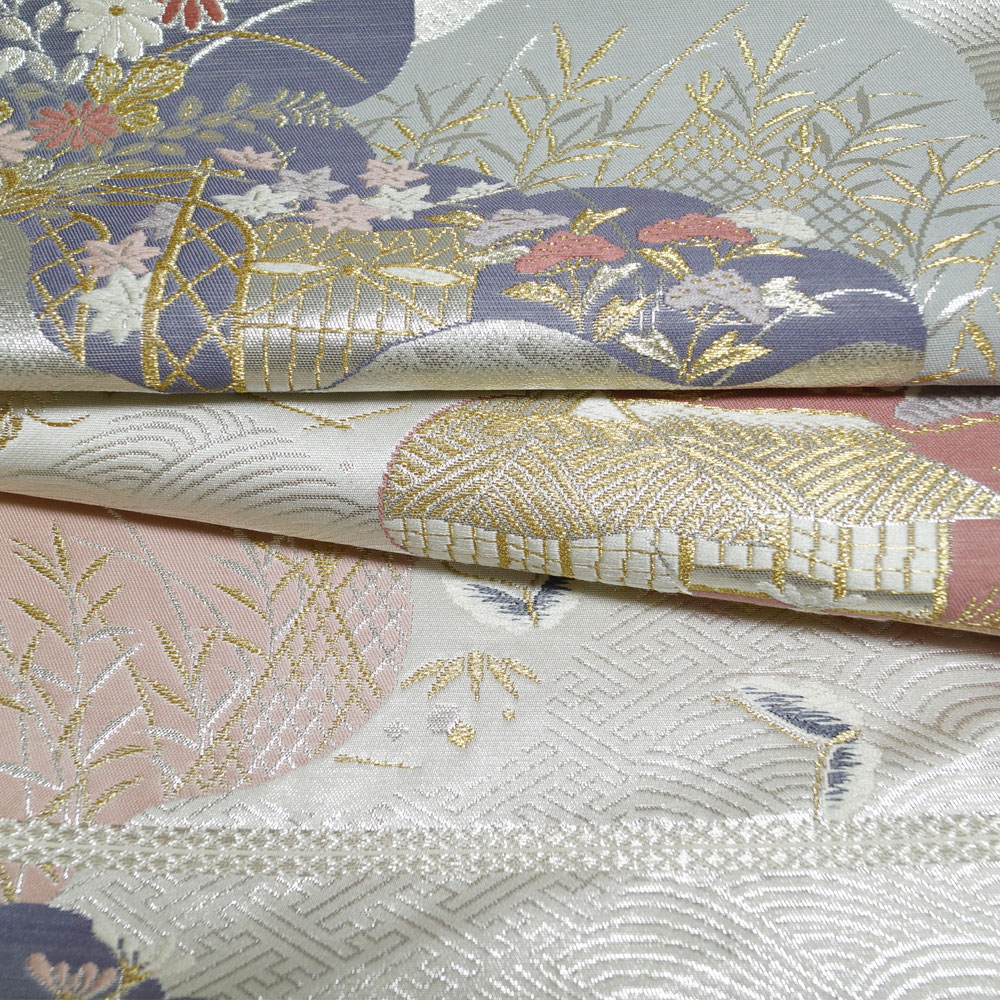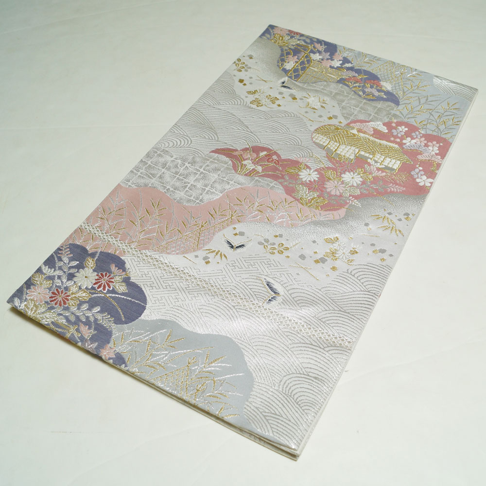 | 商品 説明 | シックな銀色系の地に道長取に茶屋辻模様などが織られた袋帯です。 |