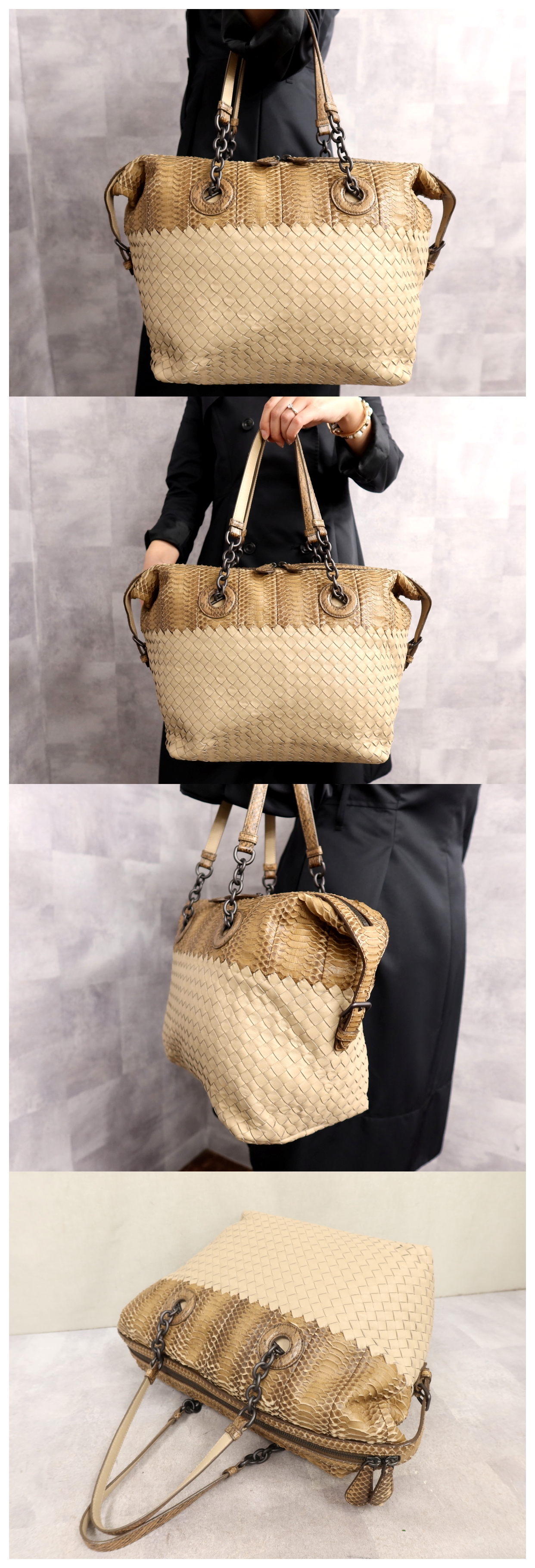 ●超美品●ボッテガ ヴェネタ●イントレチャート●パイソン 本 ヘビ 革 カーフ レザー●チェーン トート バッグ●ベージュ●A4●Js64637 收藏