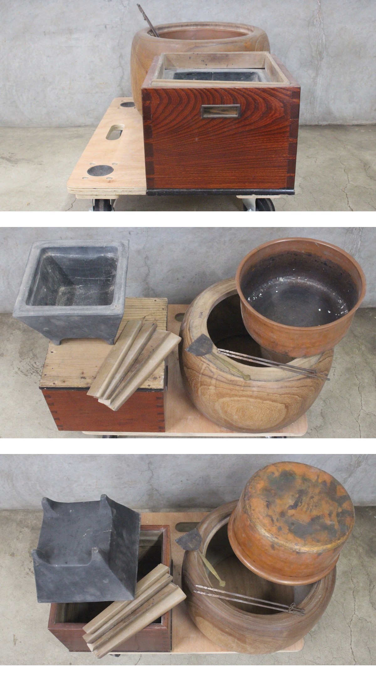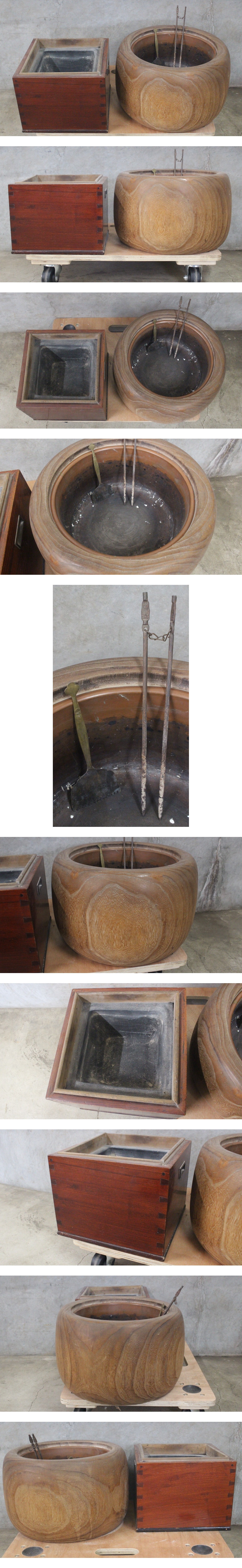 桐製刳り貫き中銅製火鉢(約3250g) 漆塗り角火鉢(約5630g) 2点セット 火箸灰ならし付き 時代物 木工工芸品 ヌ70 收藏