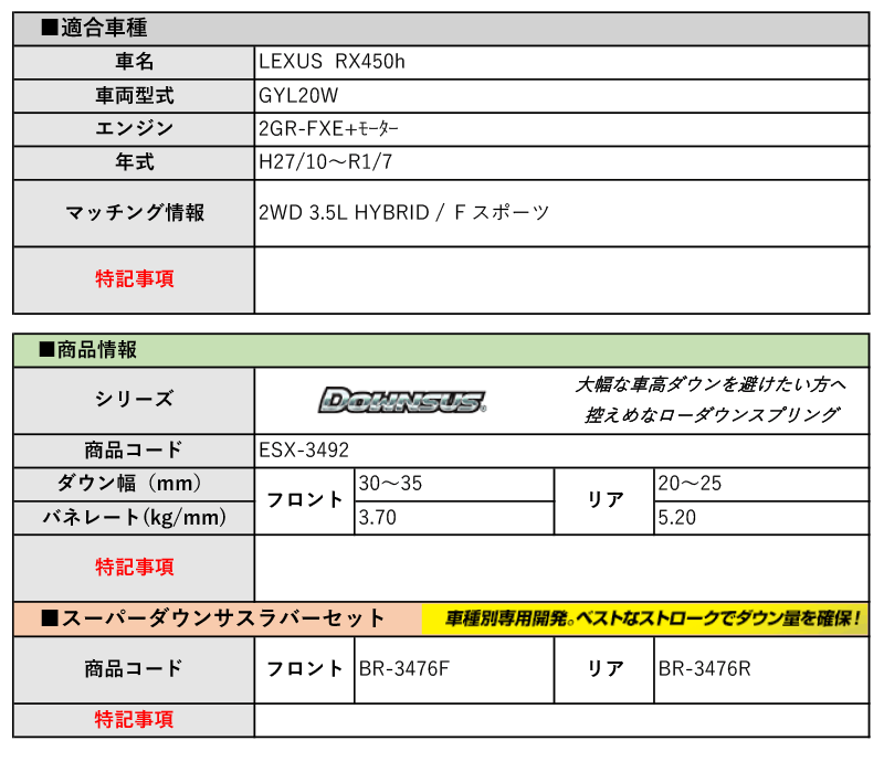 [エスペリア]GYL20W レクサスRX450h_Fスポーツ(H27/10~R1/7)用ダウンサス&バンプラバー[車検対応] 收藏