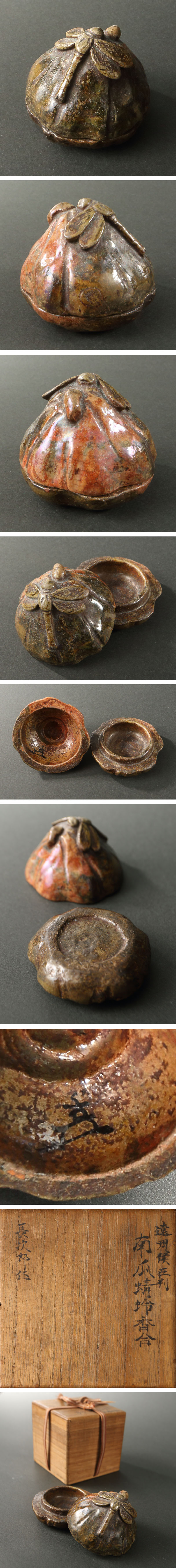 委託HK◇時代 在判南瓜蜻蛉香合(茶道具 陶磁器 陶芸 京焼 楽焼 赤楽 練香 お香 炉 勝ち虫 トンボ 武将 夏 秋 季節 古物 古美術 ) 收藏