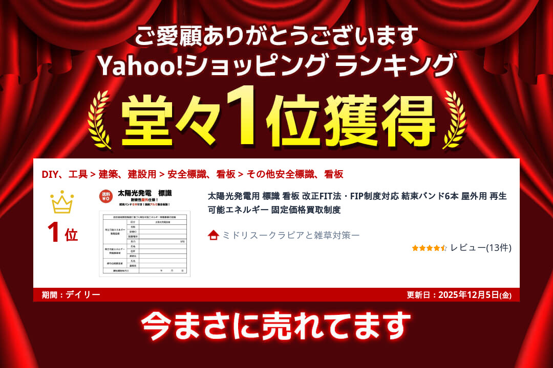 FIT制度、FIP制度を活用して20kW以上の野立て太陽光発電を設置する際に、掲示が必要な標識です。| 出价者 | 信用 | 价格 | 时间 |