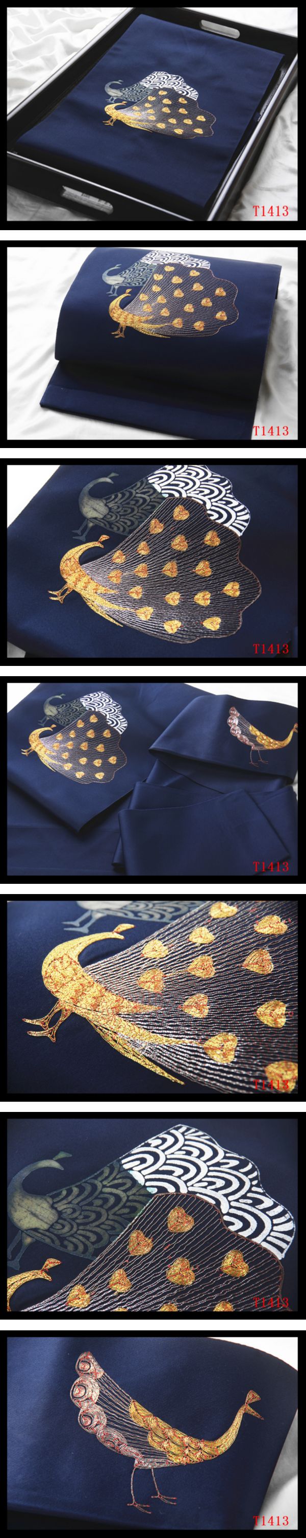 蔵【T1413】厳選逸品 金駒刺繍 孔雀紋 鉄紺色地 気品豊かに 正絹純金糸高級美術名古屋帯 ◇検◇簪着物袋帯和装小物帯締め 收藏