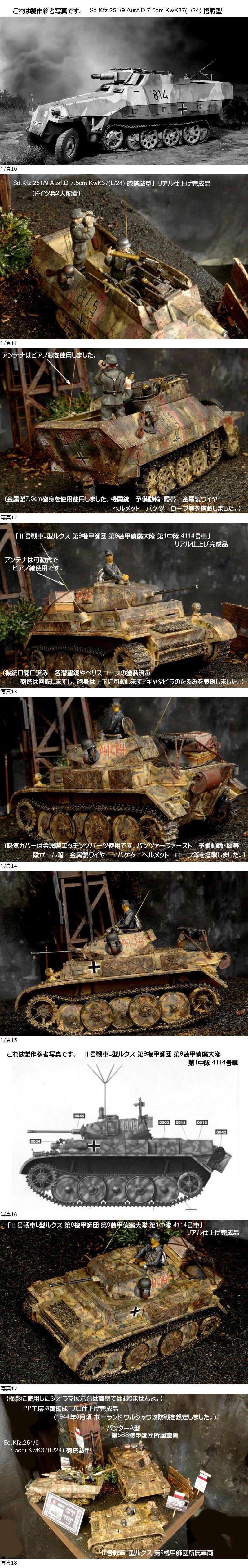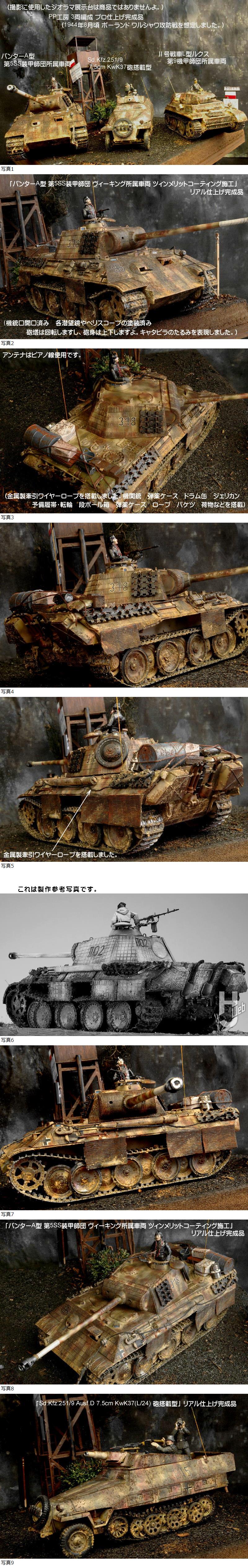 | ■今回の作品もジオラマではなく、3両編成完成品です。当店委託のプロモデラーが「ヘアスプレーチッピングやツィンメリットコーティング等」を施工するなどリアルに製作しており、クオリティは以下の商品説明の画像でも確認して下さいね。(撮影に使用したジオラマ展示台は、商品ではありませんよ。) ①1/35 「パンターA型 第5SS装甲師団 ヴィーキング所属車両 ツィンメリットコーティング施工」 リアル仕上げ完成品 (アンテナはピアノ線使用です。金属製牽引ワイヤーロープを搭載しました。機関銃 弾薬ケース ドラム缶 ジェリカン 予備履帯・転輪 段ボール箱 弾薬ケース ロープ バケツ 荷物などの装備品を搭載しました。) ドイツ兵1人を搭乗させました。 ②1/35 「Ⅱ号戦車L型ルクス 第9機甲師団 第9装甲偵察大隊 第1中隊 4114号車」 リアル仕上げ完成品 (アンテナは可動式でピアノ線使用です。吸気カバーは金属製エッチングパーツ使用です。パンツァーファースト 予備動輪・履帯 段ボール箱 金属製ワイヤー バケツ ヘルメット ロープ等を搭載しました。)ドイツ兵1人を搭乗させました。 ③1/35 「Sd.Kfz.251/9 Ausf.D 7.5cm KwK37(L/24) 砲搭載型」 リアル仕上げ完成品 (アンテナはピアノ線を使用しました。金属製7.5cm砲身を使用しました。機関銃 予備動輪・履帯 金属製ワイヤー ヘルメット バケツ ロープ等を搭載しました。)ドイツ兵2人を搭乗させました。 ■とても精度の高い作品ですが、史実に基づいて製作したものではありませんよ。(1944年8月頃 ポーランド ワルシャワ攻防戦を想定しました。) ■ヤフー画像検索で「PP工房完成品」と検索いただければ、当店の最近の作品の画像を見ることができますので、こちらも見ていただければ幸いです。・・・sa54102000 ★使用パーツなど(以下の作品がすべて付いてきますよ。) ① 1/35 タミヤ パンター A型 (機銃口開口済み 各潜望鏡やペリスコープの塗装済み 砲塔は回転しますし、砲身は上下しますよ。キャタピラのたるみを表現しました。)ドイツ兵1人を搭乗させました。 ② 1/35 アスカ Ⅱ号戦車L型ルクス(機銃口開口済み 各潜望鏡やペリスコープの塗装済み 砲塔は回転しますし、砲身は上下に可動します。キャタピラのたるみを表現しました。)ドイツ兵1人を搭乗させました。 ③ 1/35 DRAGON Sd.Kfz.251/9 Ausf.D 7.5cm砲搭載型(機銃口開口済み 各潜望鏡やペリスコープの塗装済み 砲身は上下に可動します。キャタピラのたるみを表現しました。)ドイツ兵2人を搭乗させました。 ④ 金属製ネームプレート板「パンター A型」を配置しました。 ■当店(PP工房)では、プラモ完成品を週3回位の割合で出品しておりますので、よろしくおねがいします。 | |