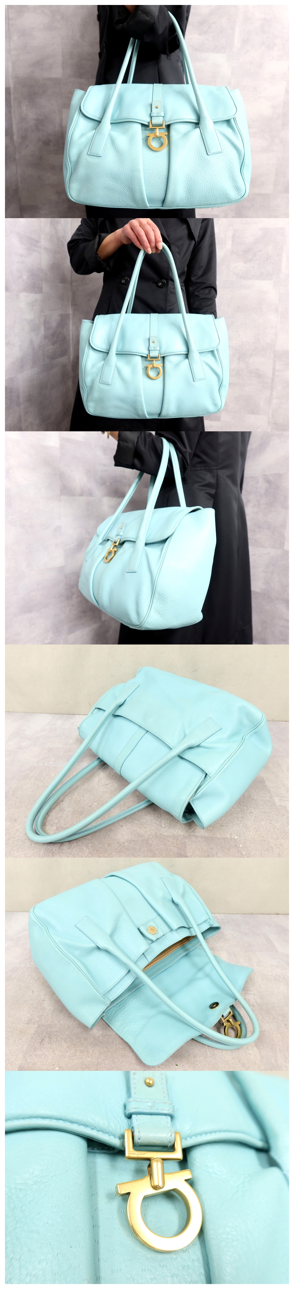 ●超美品●Salvatore Ferragamo フェラガモ●ガンチーニ●カーフ レザー 本革●ハンド バッグ●ミントブルー●ゴールド金具●A4●Js64233 收藏
