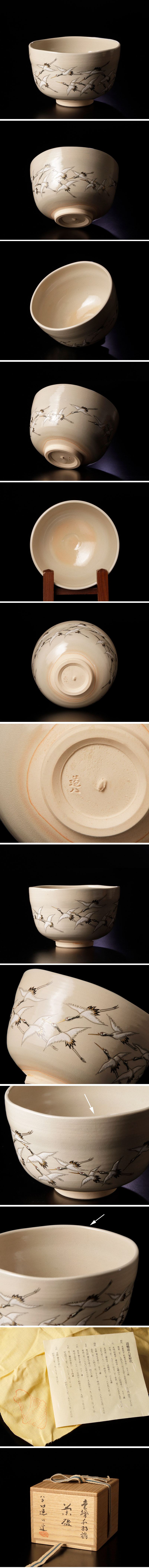 群れ舞う鶴の姿が細密に描かれ、端正な造りと相まって、穏やかな情景が手元に広がるお茶碗です。静かな余韻を湛えた佇まいが印象的です。 ★商品は八代高橋道八の作品である事を保証致します。 |