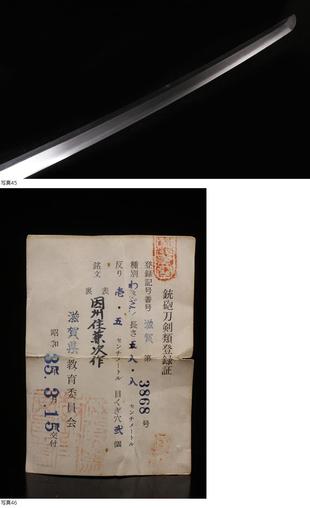 260117K13 T* * * 商品詳細 * * * ここでしか出逢うことのできない唯一の美をご紹介させて頂きます。 歴史を感じさせる重厚な軍刀拵に身を包む脇差のご紹介です。 刃渡58.8㎝と刀と見紛うほどの迫力があります。 傷などありますが沸よくつく美しい刀身で、当時は輝かしい姿をしていた事が伺えます。 桜の意匠が使用された凛々しい軍刀拵と共に衰えぬ覇気を感じさせる逸品です。 この機会に是非お求めください。 ■商品内容/脇差本体、軍刀拵、登録証。 ■本身サイズ 全長/74㎝ 刃渡/58.8㎝ 元幅/3.1㎝ 先幅/2.4㎝ 元重/0.8㎝ 先重/0.6㎝ 本身重量/663g ■拵サイズ 全長/94㎝ 反り/1.7㎝ 柄/23.5cm 内径/横0.9㎝×縦2.7㎝ 鞘/69.5cm 鯉口内径/横1.3㎝×縦3.5㎝ 鍔/横5.8cm×縦7.2cm×厚み0.8cm 重さ142g 粉が出る為一部ビニールラップで保護してあります。 ■状態/本身にキズ、サビ、切先に欠け、極小さな刃毀れがございます。ハギレはありません。 拵にスレ、キズ、サビ、剥げ、鞘に破れ、紐にちぎれがございます。 ※写真にてご確認、ご了承の上ご入札ください。 ご落札(購入)後は所定の期日までに都道府県の教育委員会に所有者変更の届出をお願い致します。 * * * 支払詳細 * * * !かんたん決済 * * * 発送詳細 * * * 入金確認後3営業日以内に発送致します。 ※直接引き取りも可能です。 60~160サイズにつきましては 佐川急便、ゆうパックのどちらかで発送いたします。 ゆうパック発送の場合、弊社の発送日から追跡サービスに問合せ番号が反映されるまで 約1日ほどお時間がかかりますのでご了承下さい。 * * * 注意事項 * * * 運送中の破損があった場合は速やかに当社までご連絡下さい。 保険を利用するのに受取連絡後に運送会社による現場での破損状況確認が必要となります。 勝手に返送されますと保険の適用外となりますのでご注意ください。 * * * * * * お問い合わせ:082-236-8669 |